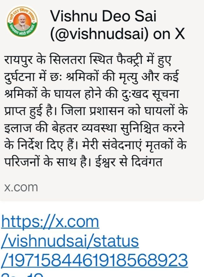 सिलतरा फैक्ट्री हादसे में 6 श्रमिकों की मौत, कई घायल – मुख्यमंत्री श्री विष्णु देव साय ने जताया गहरा शोक
