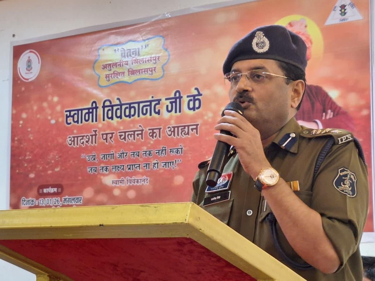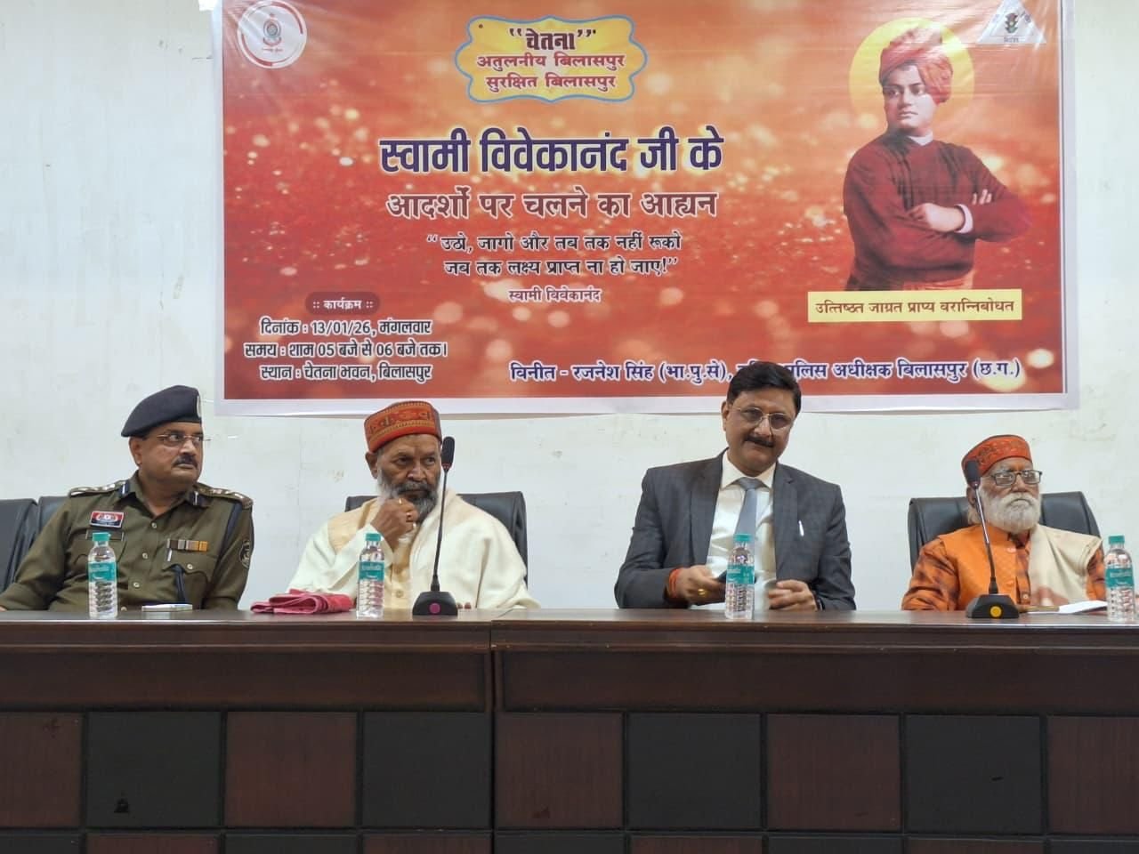 बिलासपुर 13 जनवरी 2026:- स्वामी विवेकानंद जी के आदर्शों पर चलने का आह्वान…“उठो जागो और तब तक नहीं रुको जब तक लक्ष्य प्राप्त न हो जाए “बिलासपुर के वरिष्ठ पुलिस अधीक्षक  रजनेश सिंह  के द्वारा चलाए जा रहे बहुउद्देशीय अभियान चेतना के अंतर्गतपुलिस लाइन स्थित चेतनाहाल में स्वामी विवेकानंद जी के जन्म दिवस के अवसर पर एक गोष्ठी का आयोजन किया गया।