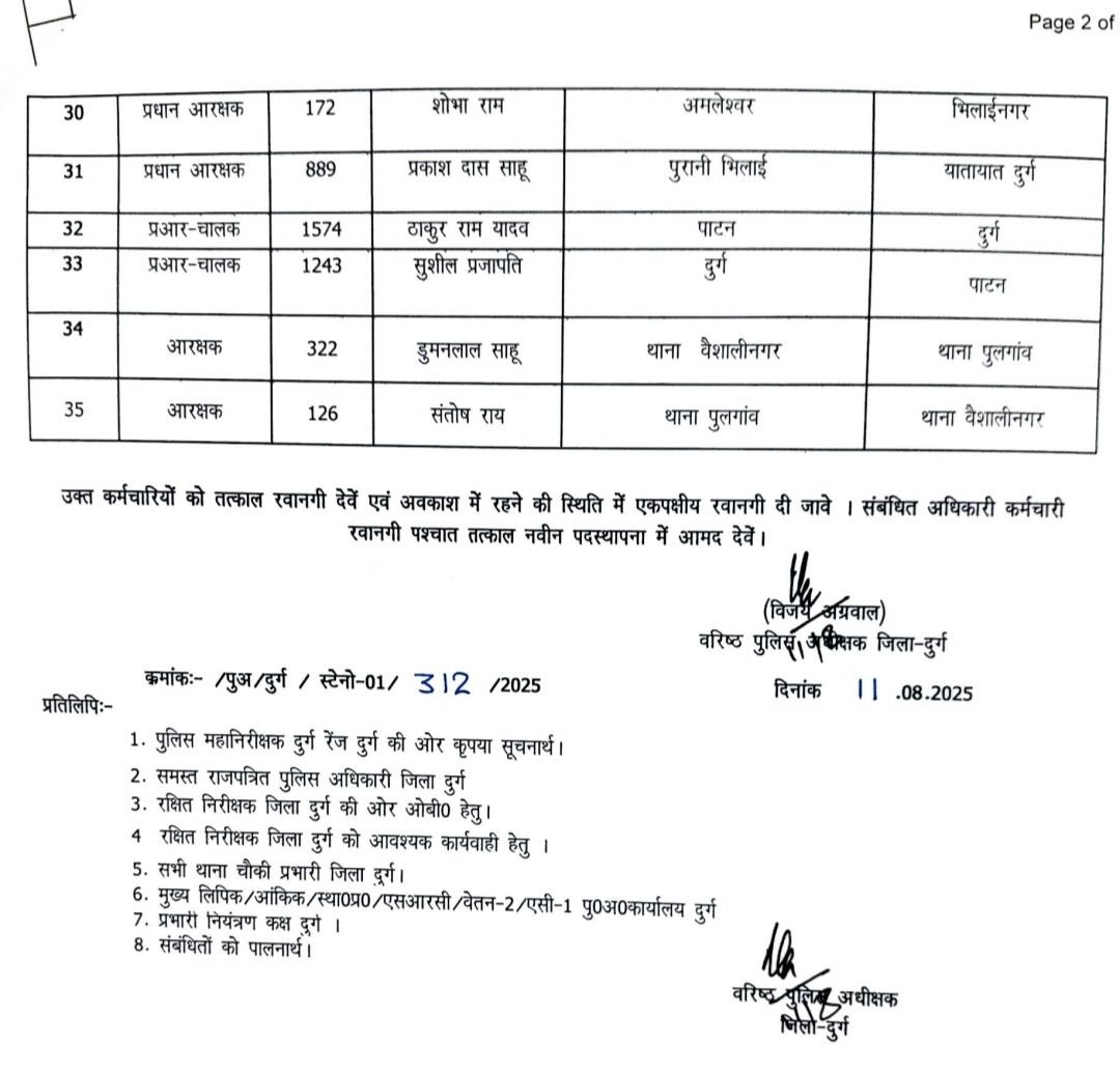 दुर्ग 11 अगस्त 2025:- वरिष्ठ पुलिस अधीक्षक विजय अग्रवाल ने आज दो उप निरीक्षक दो निरीक्षक पांच सहायक उप निरीक्षक 26 प्रधान आरक्षक एवं दो आरक्षकों का प्रशासनिक कारणों से आगामी आदेश पर्यन्त तबादला आदेश जारी किया है।