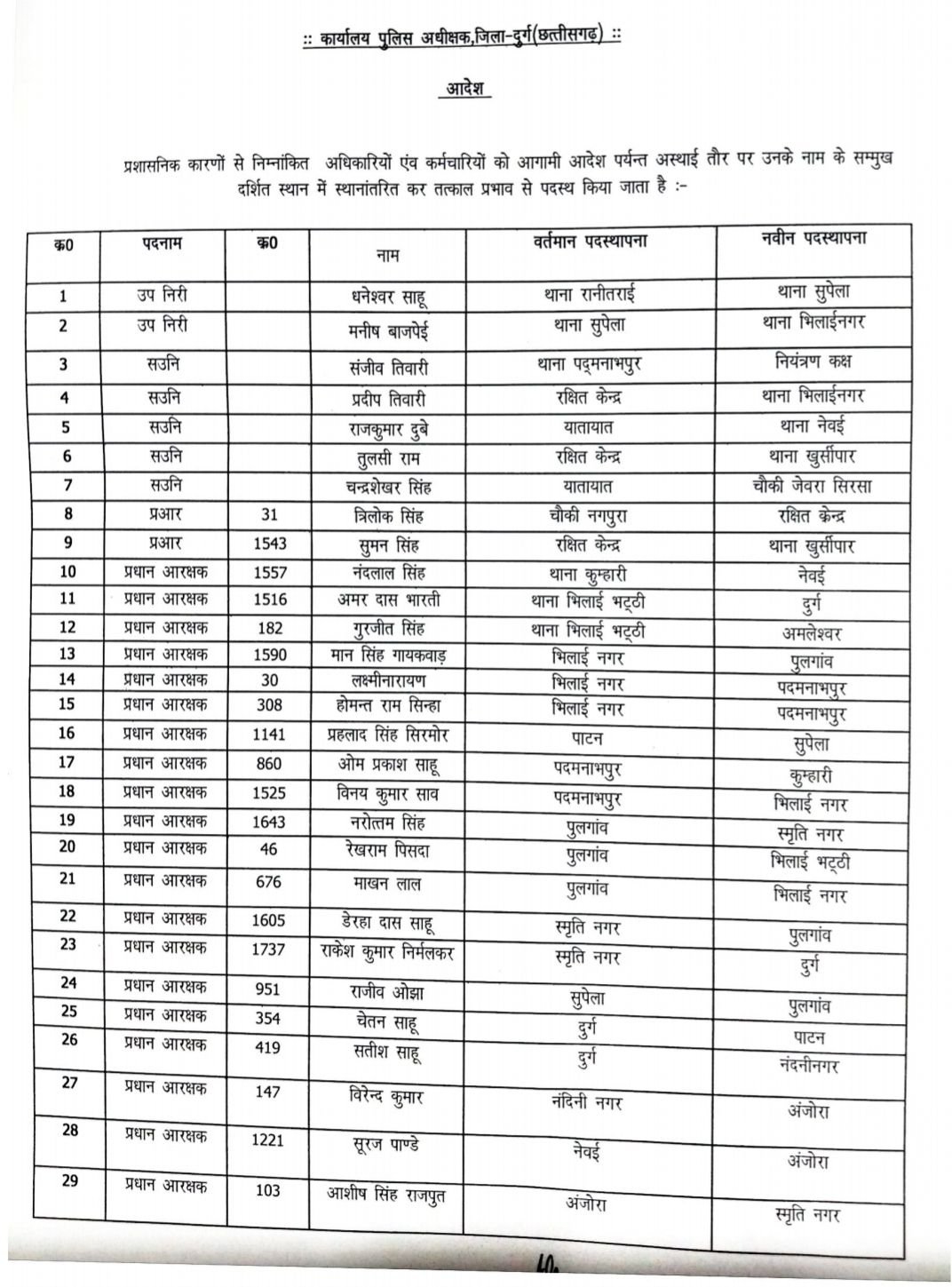 वरिष्ठ पुलिस अधीक्षक विजय अग्रवाल द्वारा जारी आज तबादला आदेश के अनुसार उप निरीक्षक धनेश्वर साहू रानी तराई से थाना सुपेला,मनीष बाजपेई थाना सुपेला से थाना भिलाई नगर, सहायक उप निरीक्षक संजीव तिवारी थाना पद्मनाभपुर से नियंत्रण कक्ष, प्रदीप तिवारी पुलिस लाइन से भिलाई नगर, राजकुमार दुबे यातायात से नेवई ,तुलसीराम पुलिस लाइन से थाना खुर्सीपार , चंद्रशेखर सिंह यातायात से चौकी जेवरा सिरसा, तबादला किया गया है