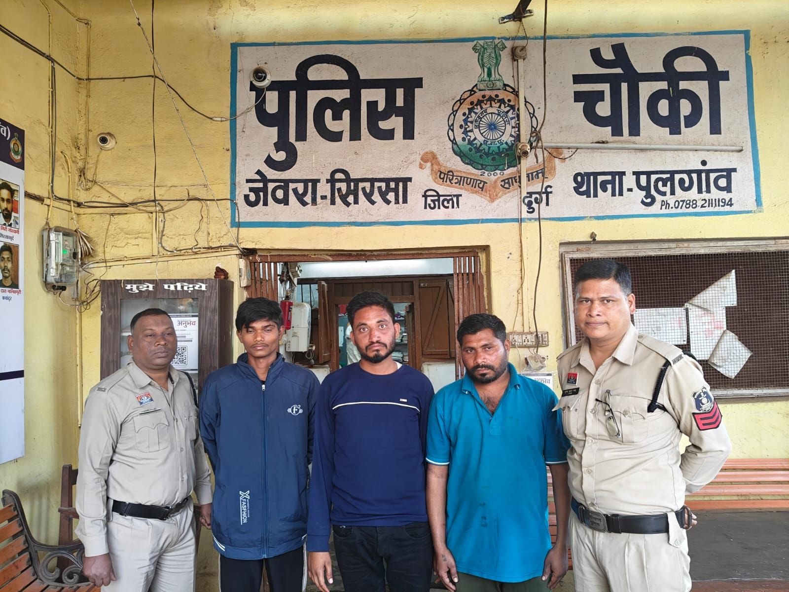 प्रकरण में अज्ञात आरोपियो का लगातार पता तलाश किया जा रहा था पता तलाश विवेचना दौरान ग्राम करंजा भिलाई के ही रहने वाले संदेही दुर्गेश पटेल उर्फ पिन्टू , गोवर्धन पटेल एवं डिकेश पटेल को घेराबंदी कर पकडा जाकर हिरासत में लेकर कडाई से पूछताछ करने पर उपरोक्त अपराध घटित करना स्वीकार किये
