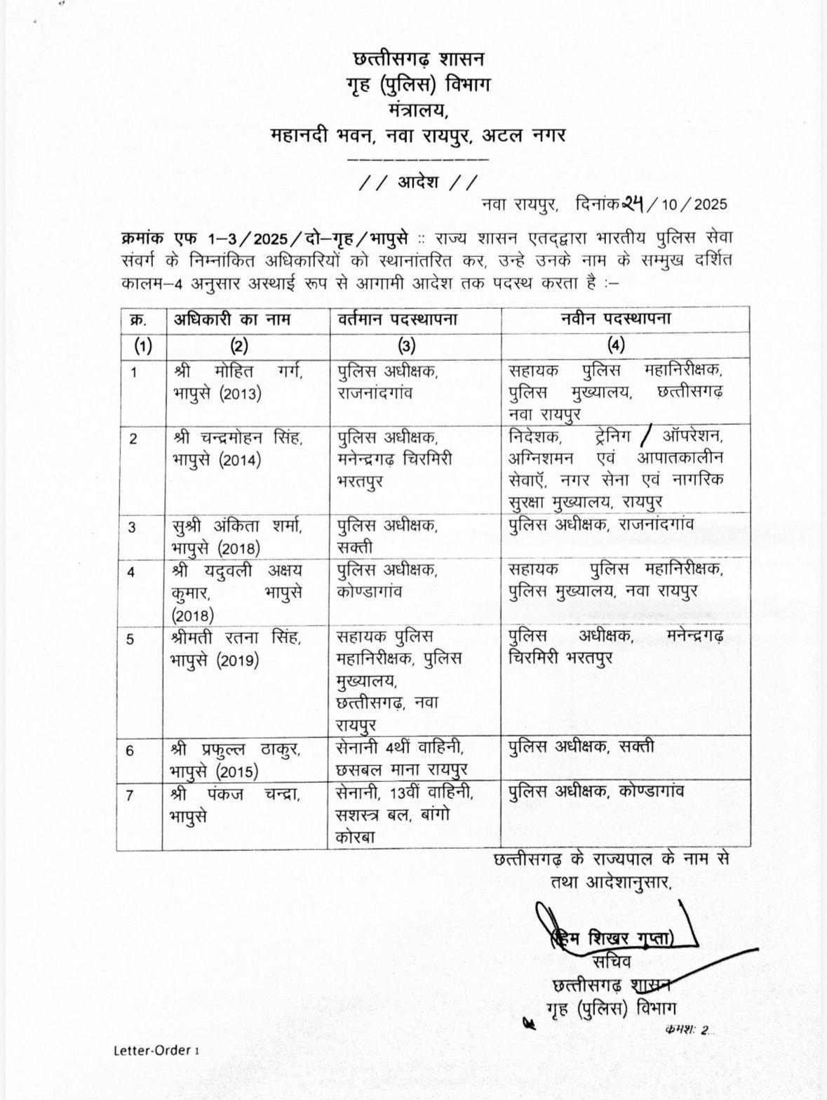 रायपुर 24 अक्टूबर 2025 :- राज्य सरकार ने भारतीय पुलिस सेवा के सात अधिकारियों के तबादले किए हैं। इस कड़ी में राजनंदगांव, कोंडागांव,सक्ती, मनेंद्रगढ़- भरतपुर – चिरमिरी , चार जिलों के पुलिस अधीक्षक बदले गए हैं। इस आशय के आदेश जारी कर दिए गए हैं।