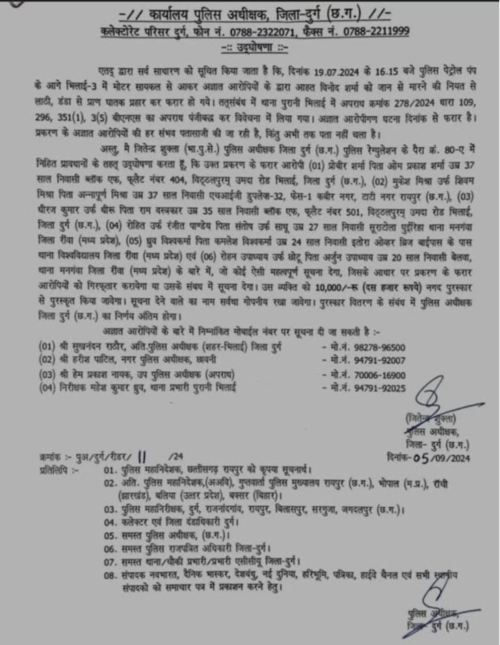 प्रकरण के फरार आरोपी प्रोबीर शर्मा 37 साल,निवासी ब्लॉक एफ, लैट नंबर 404, विठ्ठलपुरम, उमदा रोड भिलाई, मुकेश मिश्रा उर्फ शिवम मिश्रा, 37 साल, निवासी एचआईजी डुपलेक्स-32, फेस-1 कबीर नगर, रायपुर, धीरज कुमार उर्फ धीरू 35 साल,निवासी ब्लॉक एफ, लैट नंबर 501, विठ्ठलपुरम, उमदा रोड भिलाई, रोहित उर्फ रंजीत पांडेय 27 साल निवासी सूराटोला घुईरिहा थाना मनगंवा जिला रीवा (मध्यप्रदेश), ध्रुव विश्वकर्मा 24 साल, निवासी इतोरा ओव्हर ब्रिज बाइपास के पास थाना विश्वविद्यालय जिला रीवा (मध्य प्रदेश), रोहन उपाध्याय उर्फ छोटू 20 साल निवासी बेलवा, थाना मनगंवा जिला रीवा (मध्य प्रदेश) के बारे में जो कोई अहम सूचना देगा, जिसके आधार पर प्रकरण के फरार आरोपियों को गिरतार कराएगा याउसके संबध में सूचना देगा उस व्यक्ति को 10,000-10000 नकद पुरस्कार दिया जाएगा।