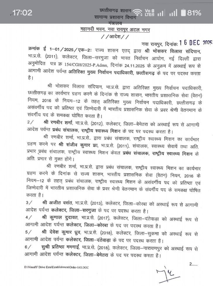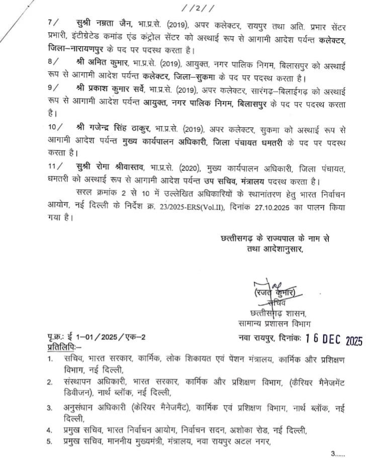 रायपुर, 16 दिसंबर 2025:- भारतीय प्रशासनिक सेवा के 11 अधिकारियों को इधर से उधर किया गया है। इस कड़ी में आधा दर्जन कलेक्टर बदले गए हैं। इनमें सरगुजा, कोरबा, बेमेतरा, दंतेवाड़ा, नारायणपुर, और सुकमा शामिल हैं। प्रकाश कुमार सर्वे को बिलासपुर नगर निगम का आयुक्त बनाया गया है।