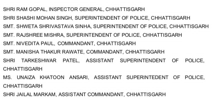 छत्तीसगढ़ पुलिस के निम्नलिखित अधिकारियों को सराहनीय सेवा के लिए पदक से सम्मानित किया गया है :