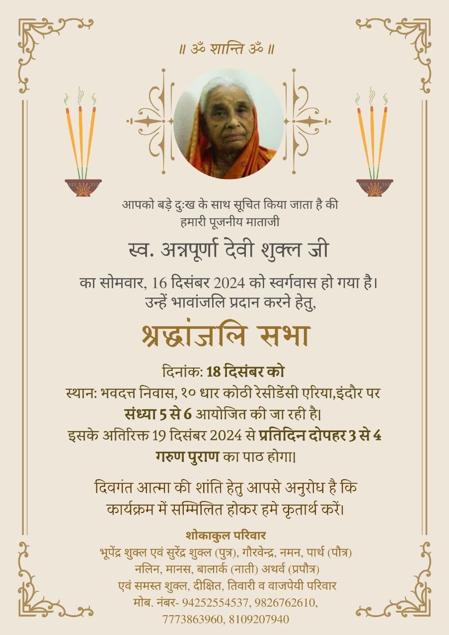इंदौर मध्य प्रदेश 17 दिसंबर 2024 :- इंदौर शहर की प्रतिष्ठित नागरिक समाज सेविका धर्म परायण दीन दुखियों की सेवा में सदैव तत्पर रहने वाली लोगों के सुख-दुख में हमेशा अग्रिम पंक्ति में खड़े रहने वाली श्रीमती अन्नपूर्णा देवी शुक्ला (पत्नी स्व. ओमकार प्रसाद शुक्ला) का 90 वर्ष की आयु में 16 दिसंबर 2024 को इंदौर मध्य प्रदेश में निधन हो गया उनका अंतिम संस्कार सोमवार 16 दिसंबर को अपराह्न 3:00 बजे पिपलियापाला मुक्ति धाम रीजनल पार्क इंदौर में संपन्न हुआ।