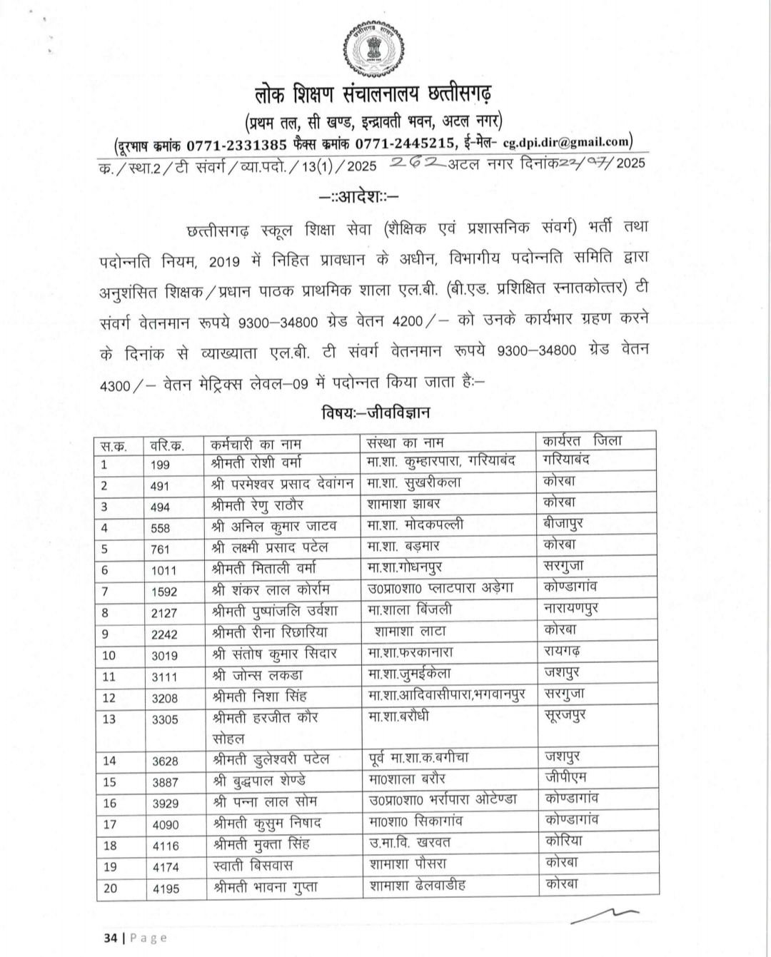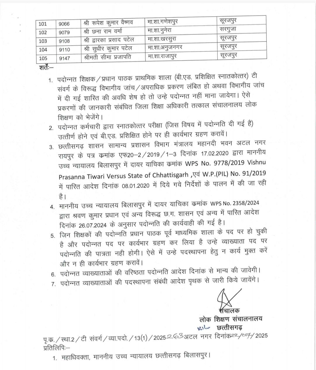 रायपुर, 23 जुलाई 2025/ मुख्यमंत्री विष्णु देव साय के निर्देशों पर राज्य सरकार द्वारा शिक्षा क्षेत्र में निरंतर सुधार और शिक्षक समुदाय के हित में त्वरित निर्णय लिए जा रहे हैं। इसी क्रम में स्कूल शिक्षा विभाग द्वारा आज दिनांक 23 जुलाई 2025 को विभिन्न विषयों के 1227 व्याख्याता (टी संवर्ग) शिक्षकों को पदोन्नति आदेश जारी किए गए हैं। इन व्याख्याताओं की पदस्थापना काउंसिलिंग के माध्यम से की जाएगी। इन विषयों में हिन्दी, अंग्रेजी, संस्कृत, गणित, विज्ञान ,भौतिक, रसायन, जीवविज्ञान, राजनीति शास्त्र, इतिहास, भूगोल, अर्थशास्त्र और वाणिज्य जैसे मुख्य विषय शामिल हैं। यह निर्णय सरकार की उस प्रतिबद्धता को दर्शाता है, जिसके अंतर्गत राज्य के शिक्षकों को उनके कार्य, वरिष्ठता और योग्यता के आधार पर समय पर पदोन्नति और अवसर उपलब्ध कराया जा रहा है।