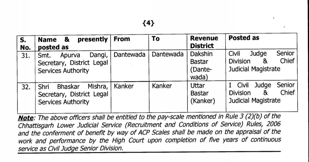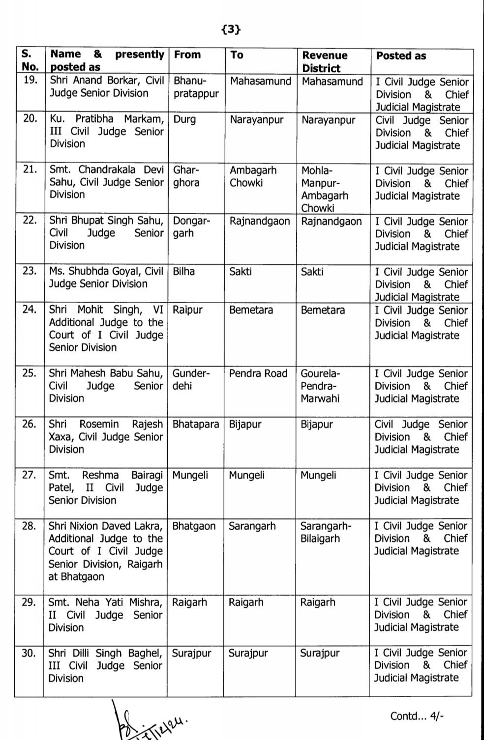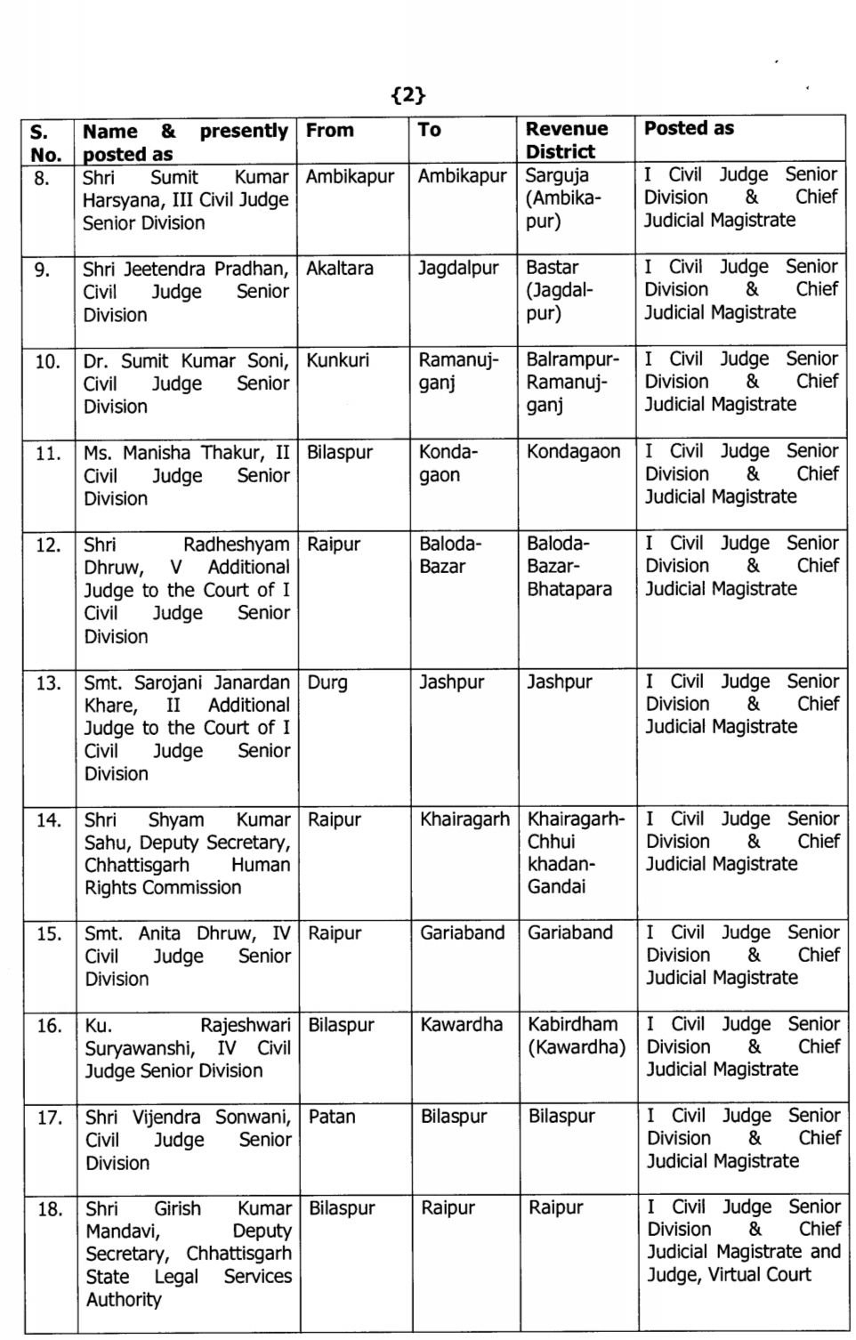 जारी आदेश में रायगढ़ के डिस्ट्रिक्ट एंड एडिशनल सेशन जज संतोष कुमार आदित्य को बिलासपुर जुडिशल ऑफिसर ट्रेनिंग इंस्टिट्यूट का डायरेक्टर बनाया गया हैं। जुडिशल ऑफिसर ट्रेनिंग इंस्टिट्यूट के डायरेक्टर सिराजुद्दीन कुरैशी को बिलासपुर का प्रधान जिला एवं सत्र न्यायाधीश बनाया गया है।