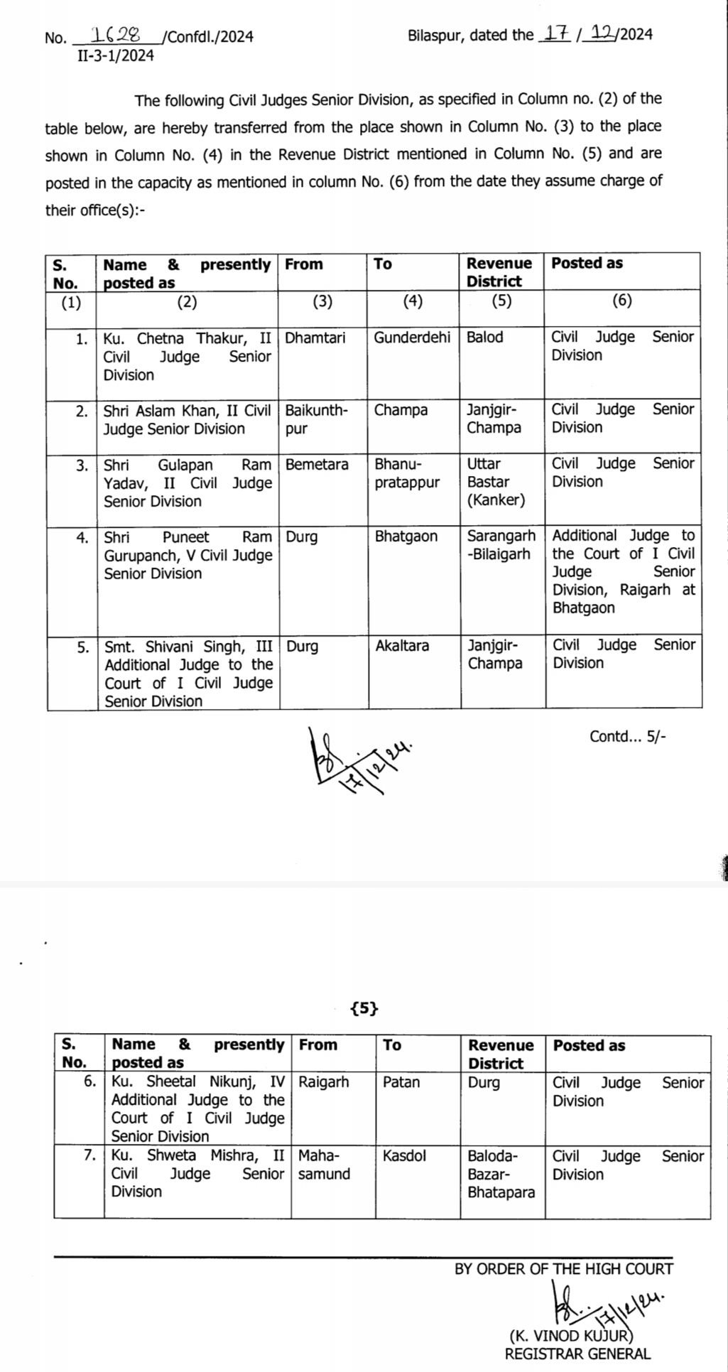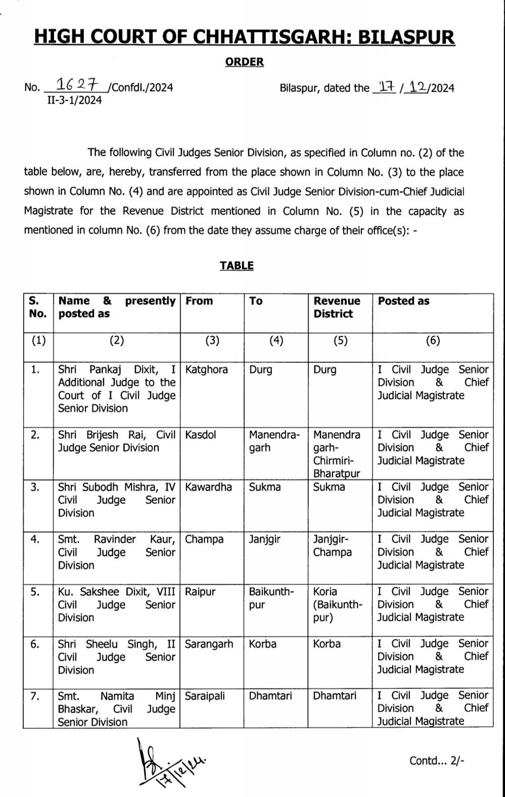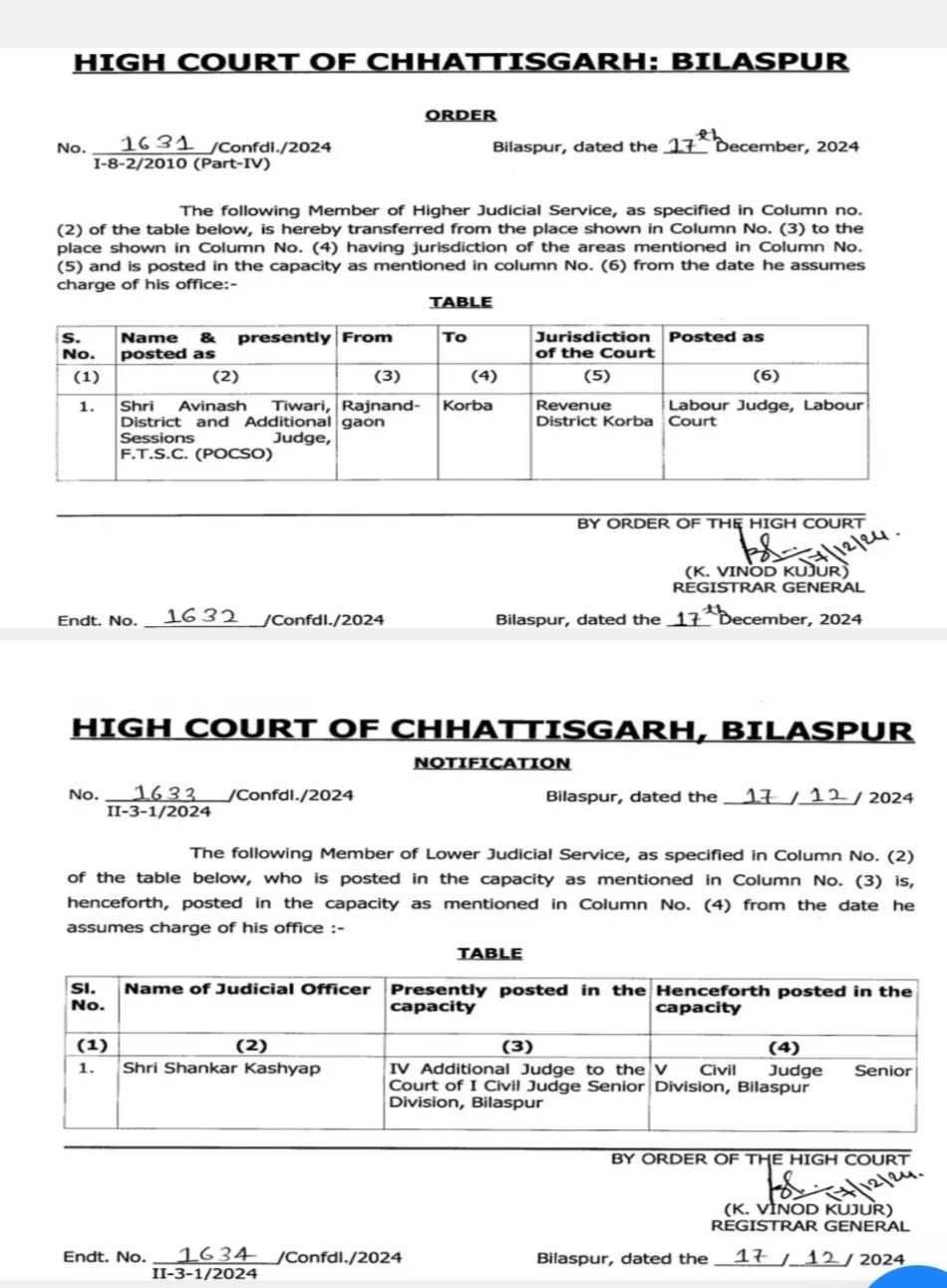 बिलासपुर 18 दिसंबर 2024:- छत्तीसगढ़ हाईकोर्ट ने सिविल जजों के तबादला और प्रमोशन का आदेश जारी किया है। जारी आदेश के मुताबिक कुछ जजों का तबादला हुआ है वहीं कुछ का तबादले के साथ प्रमोशन भी हुआ है।