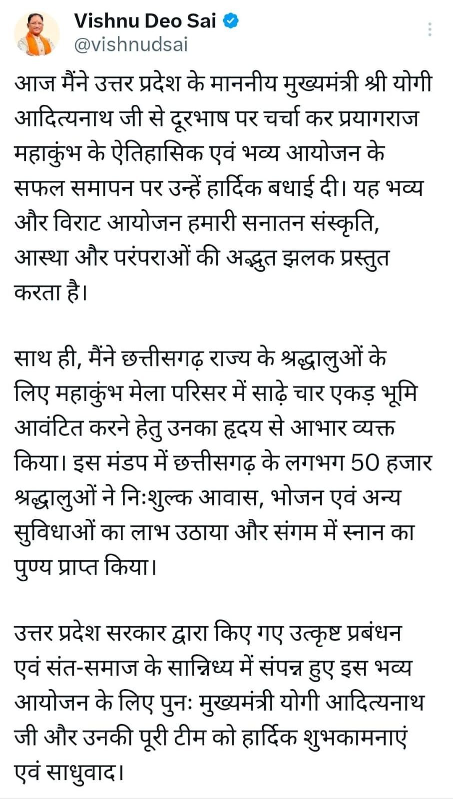 महाकुम्भ के समापन पर छत्तीसगढ़ के मुख्यमंत्री श्री विष्णुदेव साय ने उत्तर प्रदेश के मुख्यमंत्री को महाकुम्भ के सफल आयोजन और छत्तीसगढ़ को साढ़े चार एकड़ जगह उपलब्ध कराने के लिए धन्यवाद दिया है।