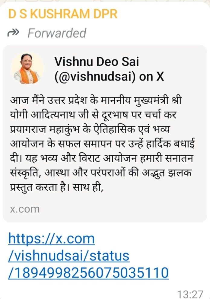मुख्यमंत्री श्री साय ने उत्तर प्रदेश के मुख्यमंत्री श्री योगी आदित्यनाथ को दी महाकुंभ के सफल आयोजन की बधाई