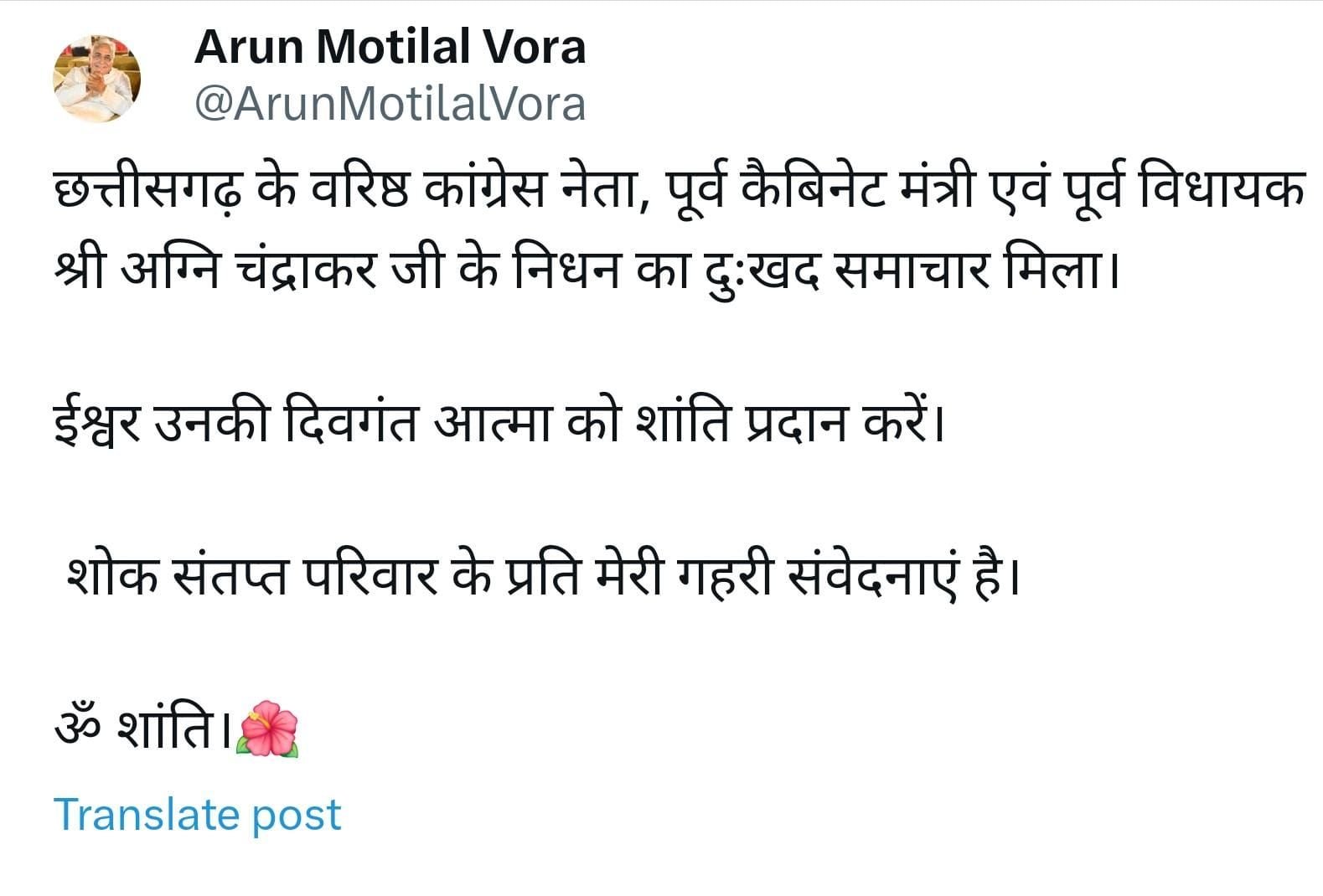 रायपुर, 23 जून 2024/ महासमुंद के पूर्व विधायक और वरिष्ठ नेता श्री अग्नि चन्द्राकर के निधन पर मुख्यमंत्री श्री विष्णु देव साय ने शोक जताया है। मुख्यमंत्री ने स्वर्गीय श्री चन्द्राकर की आत्मा की शांति की प्रार्थना के साथ ही पीड़ित परिवारजनों के प्रति संवेदना भी व्यक्त की है।