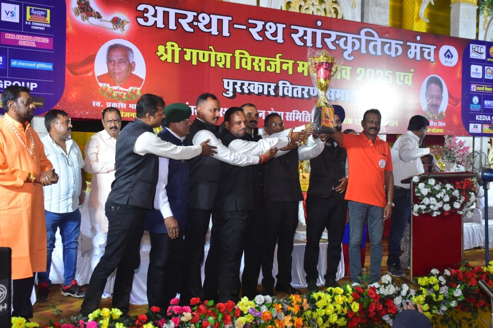 आस्था रथ सांस्कृतिक मंच के 10 वें वर्ष के आयोजन में राजनीति से परे एकता का संदेश देते हुए जनप्रतिनिधि और समाजसेवी शामिल हुए । कार्यक्रम में पूर्व विधानसभा अध्यक्ष प्रेम प्रकाश पाण्डेय, पूर्व गृह मंत्री ताम्रध्वज साहू, भिलाई नगर विधायक देवेंद्र यादव, वैशाली नगर विधायक रिकेश सेन, दुर्ग ग्रामीण विधायक ललित चंद्राकर, पूर्व विधायक प्रतिमा चंद्राकर, भिलाई नगर विधायक नीरज पाल सहित समाजसेवी इंद्रजीत सिंग छोटू, मलकीत सिंग लल्लू ,हरेंद्र यादव, धीरेंद्र प्रताप सिंह, नगर निगम की पूर्व नेता प्रतिपक्ष एवं पार्षद सुभद्रा सिंह, डॉ.सुशोवन रॉय, सहित समाज के अन्य लोग शामिल हुए । यहां पहुंचे सभी अतिथीयों ने आस्था-रथ सांस्कृतिक मंच द्वारा गणेश पूजन समितियों को हर वर्ष सम्मानित कर उनका हौसला बढाने और सभी को एक जुट कर भिलाई की एकता और अखंडता को परिभाषित करते हुए धर्म और संस्कृति की रक्षा करने के लिए बधाई दी।