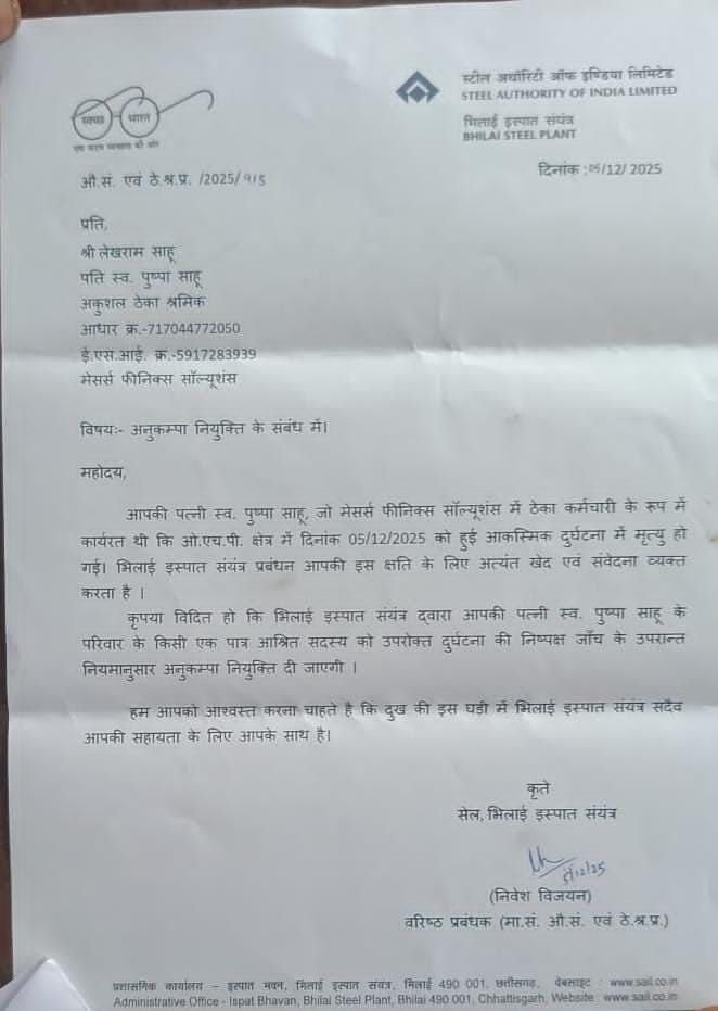 भिलाई इस्पात संयंत्र के ओएचपी के पास 05 दिसम्बर 2025 को लगभग 10.25 बजे एक दुखद घटना घटी। संविदा श्रमिक, श्रीमती पुष्पा साहू (41 वर्ष), जो एम/एस फीनिक्स सॉल्यूशंस में यूएसडब्ल्यू के रूप में कार्यरत थीं, 05.12.2025 को लगभग 10:25 बजे जी शिफ्ट में भिलाई इस्पात संयंत्र के बेल्ट वैगन टिपलर क्रमांक 4 ( जे 3 सी 2 ), ओएचपी के पास एक दुर्घटना का शिकार हो गईं।