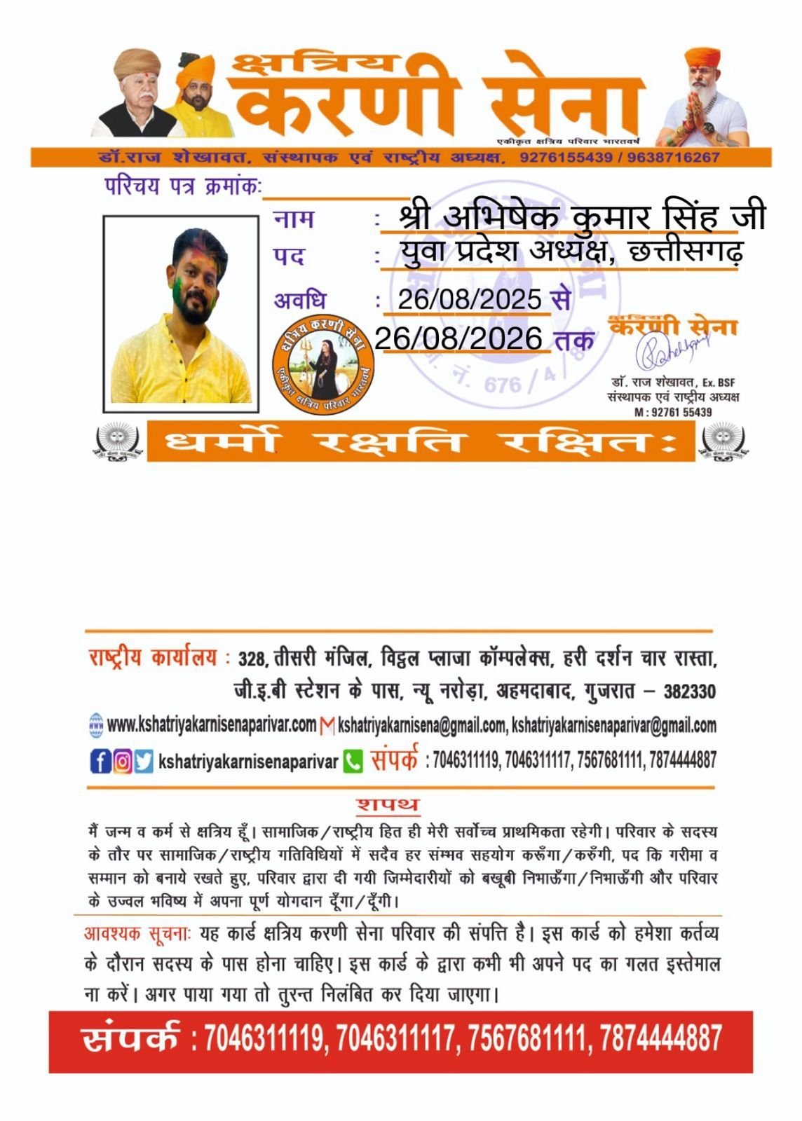 करणी सेना के युवा प्रदेश अध्यक्ष के रूप में अभिषेक सिंह की नियुक्ति
