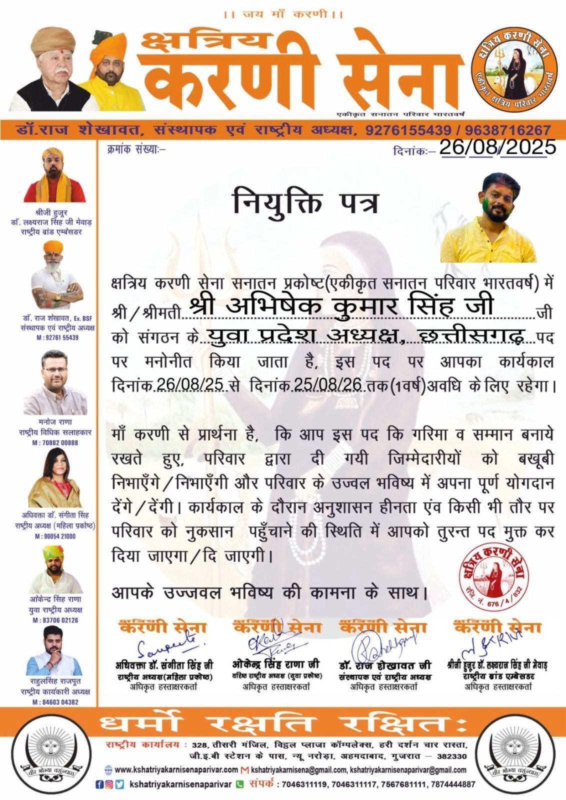 रायपुर 27 अगस्त2025:- करणी सेना ने अभिषेक सिंह को प्रदेश युवा अध्यक्ष के रूप में नियुक्त किया है। इस नियुक्ति के साथ ही अभिषेक सिंह करणी सेना की गतिविधियों को और अधिक मजबूती से आगे बढ़ाएंगे और संगठन के उद्देश्यों को प्राप्त करने में महत्वपूर्ण भूमिका निभाएंगे।