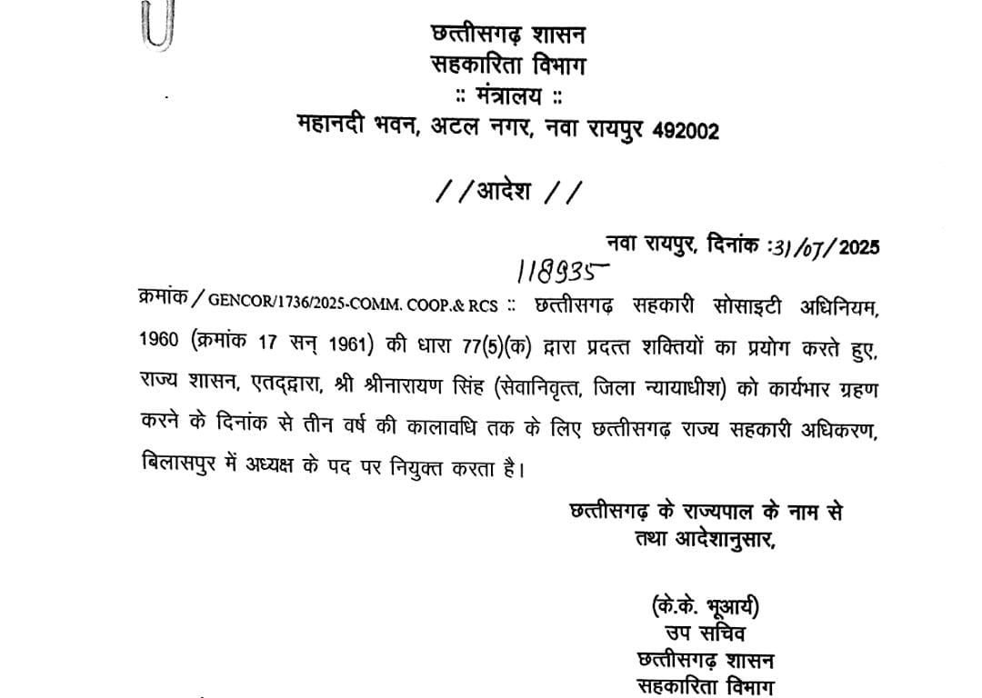 रायपुर, 1 अगस्त 2025:- राज्य सरकार ने रिटायर्ड जज नारायण सिंह को राज्य सहकारी अधिकरण और रिटायर्ड आईएएस विपिन मांझी को राज्य सहकारी निर्वाचन आयुक्त के पद पर नियुक्ति की है।
