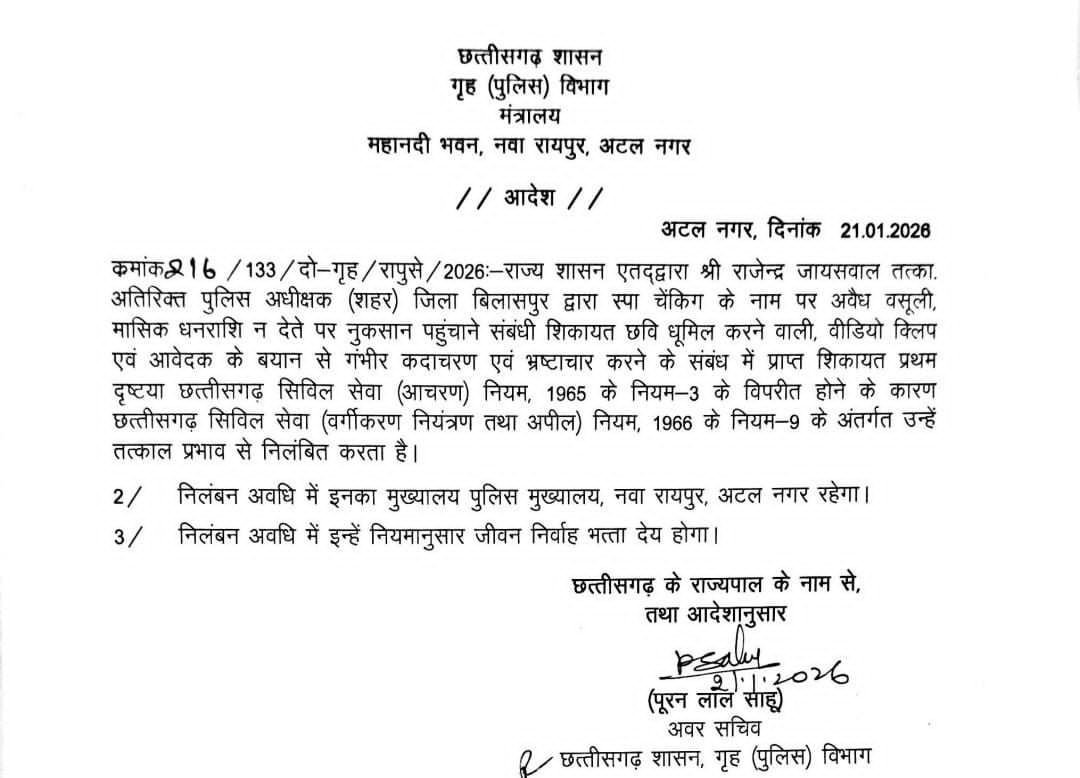 बिलासपुर में एडिशनल एसपी रहते हुए स्पा सेंटर से मंथली रकम की वसूली के लिए दबाव बनाने वाले एडिशनल एसपी राजेंद्र जायसवाल को गृह मंत्री विजय शर्मा ने निलंबित करने के निर्देश दिए हैं। वसूली का मामला सामने आने के बाद गृह मंत्री ने सख्ती दिखाई है। इस मामले की जांच और मामले की प्रथम दृष्टया गंभीरता को देखते हुए बिलासपुर के तत्कालीन एडिशनल एसपी राजेंद्र जायसवाल को निलंबित करने के निर्देश दिए गए है। बता दे वर्तमान में राजेंद्र जायसवाल गौरेला पेंड्रा मरवाही के एडिशनल एसपी हैं। सोशल मीडिया में मामला सामने आते ही बिलासपुर रेंज के पुलिस महानिरीक्षक डॉ संजीव शुक्ला ने तत्काल मामले की संज्ञान लेते हुए जांच के आदेश दिए एवं बिलासपुर के वरिष्ठ पुलिस अधीक्षक रजनेश सिंह को मामले की जांच कर रिपोर्ट देने के निर्देश दिए।