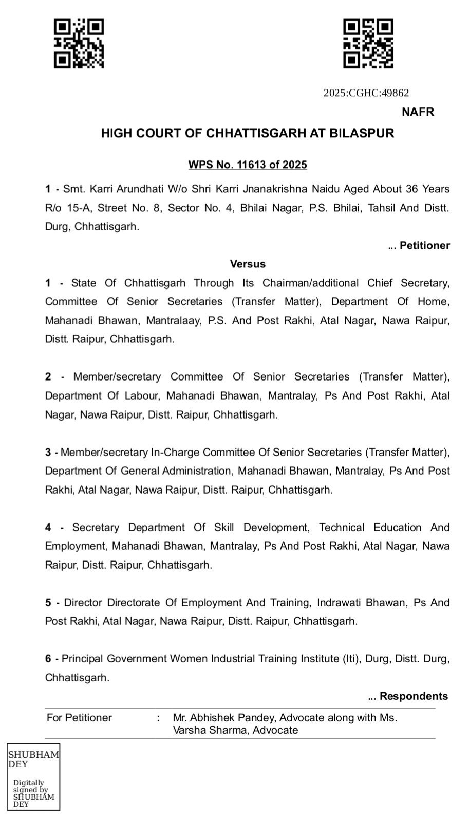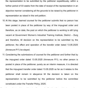 बिलासपुर 12 नवंबर 2025:- सेक्टर-4, भिलाईनगर, दुर्ग निवासी श्रीमती के. अरुन्धती महिला आई.टी. आई. कॉलेज, दुर्ग में प्रशिक्षण अधिकारी के पद पर पदस्थ थी। उक्त पदस्थापना के दौरान सचिव, तकनीकी शिक्षा एवं रोजगार विभाग, नवा रायपुर द्वारा एक आदेश जारी कर के. अरुन्धती का स्थानांतरण जिला-दुर्ग से जिला-बीजापुर कर दिया गया।