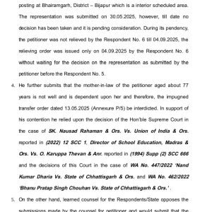 इसके साथ ही अधिवक्तागण द्वारा यह तर्क प्रस्तुत किया गया कि याचिकाकर्ता की माता श्रीमती के. भगवती की उम्र 77 वर्ष की है। वे मानसिक बीमारी से ग्रस्त होने के कारण उनका जिला-दुर्ग में ईलाज चल रहा है, याचिकाकर्ता पर उनकी बीमार माता एवं पुत्र की जिम्मेदारी है इसके बावजूद भी याचिकाकर्ता महिला का घोर अनुसूचित जिला-बीजापुर स्थानांतरण किया जाना पूर्णतः नियम विरूद्ध है। उक्त मामले में याचिकाकर्ता द्वारा माननीय सुप्रीम कोर्ट द्वारा एस. के. नौशाद रहमान एवं अन्य विरूद्ध यूनियन ऑफ इंडिया एवं अन्य के वाद में पारित न्यायदृष्टांत का हवाला दिया गया।