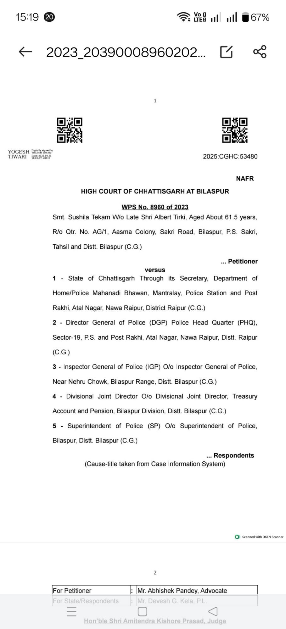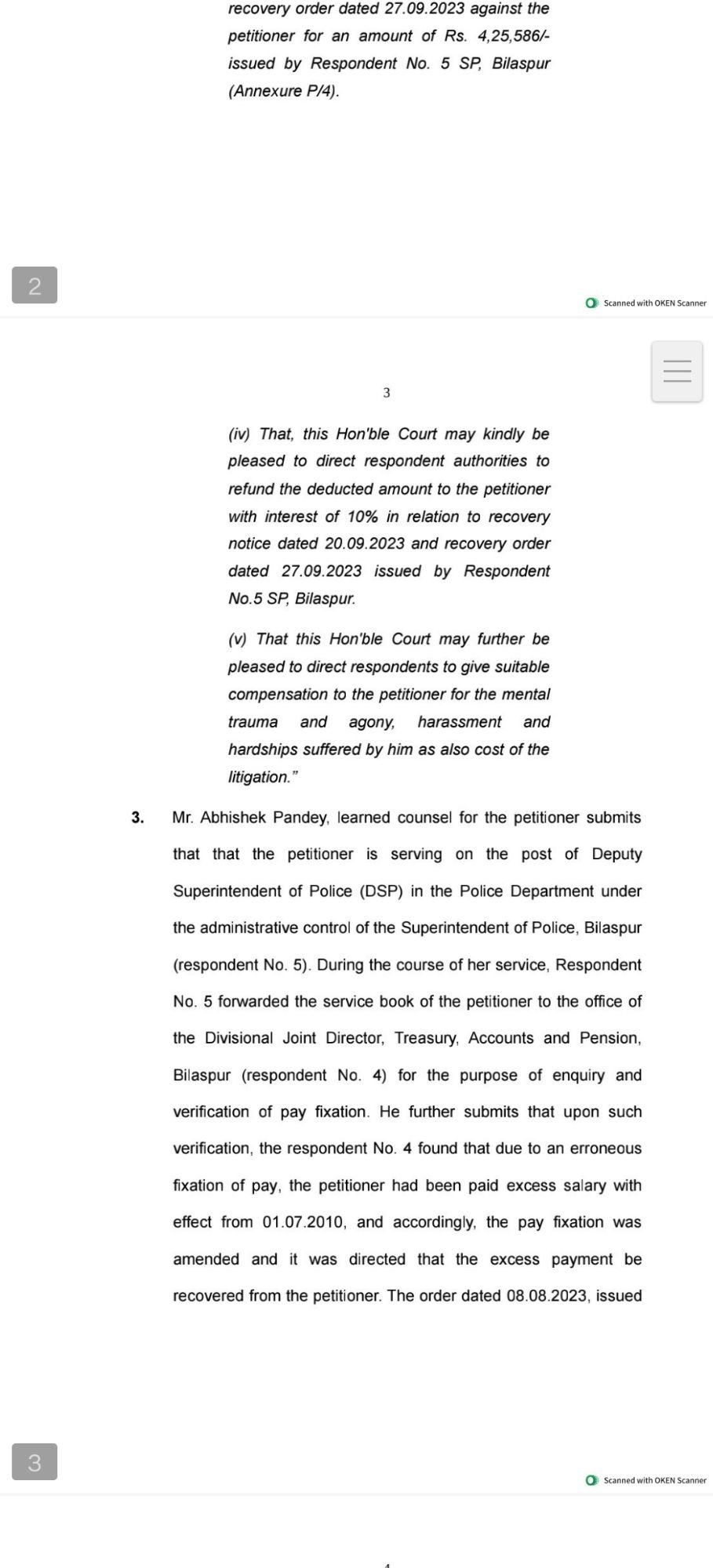 उक्त वसूली आदेश से क्षुब्ध होकर महिला डी.एस.पी. श्रीमती एस.एस.टेकाम द्वारा हाईकोर्ट अधिवक्ता अभिषेक पाण्डेय एवं वर्षा शर्मा के माध्यम से हाईकोर्ट बिलासपुर के समक्ष रिट याचिका दायर कर वसूली आदेश को चुनौती दी गई। हाईकोर्ट अधिवक्ता अभिषेक पाण्डेय एवं वर्षा शर्मा द्वारा हाईकोर्ट के समक्ष यह तर्क प्रस्तुत किया गया कि याचिकाकर्ता को अधिक वेतन भुगतान वसूली आदेश दिनांक से 05 (पांच) वर्षों पूर्व का है, इसके साथ ही याचिकाकर्ता डी.एस.पी. को वसूली आदेश सेवानिवृत्ति दिनांक से 06 (छः) माह पूर्व जारी किया गया था जो कि पूर्णतः नियमविरूद्ध है एवं निरस्त किये जाने योग्य है।