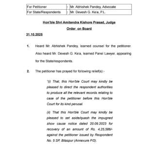 बिलासपुर 12 नवंबर 2025:- क्वार्टर नं. AG/1, आसमां कॉलोनी, बिलासपुर निवासी महिला डी.एस.पी.श्रीमती एस.एस.टेकाम कार्यालय पुलिस महानिरीक्षक (आई.जी.पी.), बिलासपुर में पदस्थ थी। उक्त पदस्थापना के दौरान पुलिस अधीक्षक (एस.पी.), बिलासपुर द्वारा डी. एस.पी. श्रीमती एस.एस. टेकाम के विरूद्ध एक वसूली आदेश इस आधार पर जारी किया गया कि उनकी सेवाकाल के दौरान वेतन नियतन में त्रुटि के कारण अधिक वेतन भुगतान कर दिया गया है, उक्त वसूली आदेश के आधार पर उनके वेतन से कटौती प्रारम्भ कर दी गई।