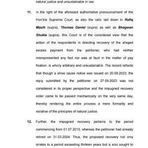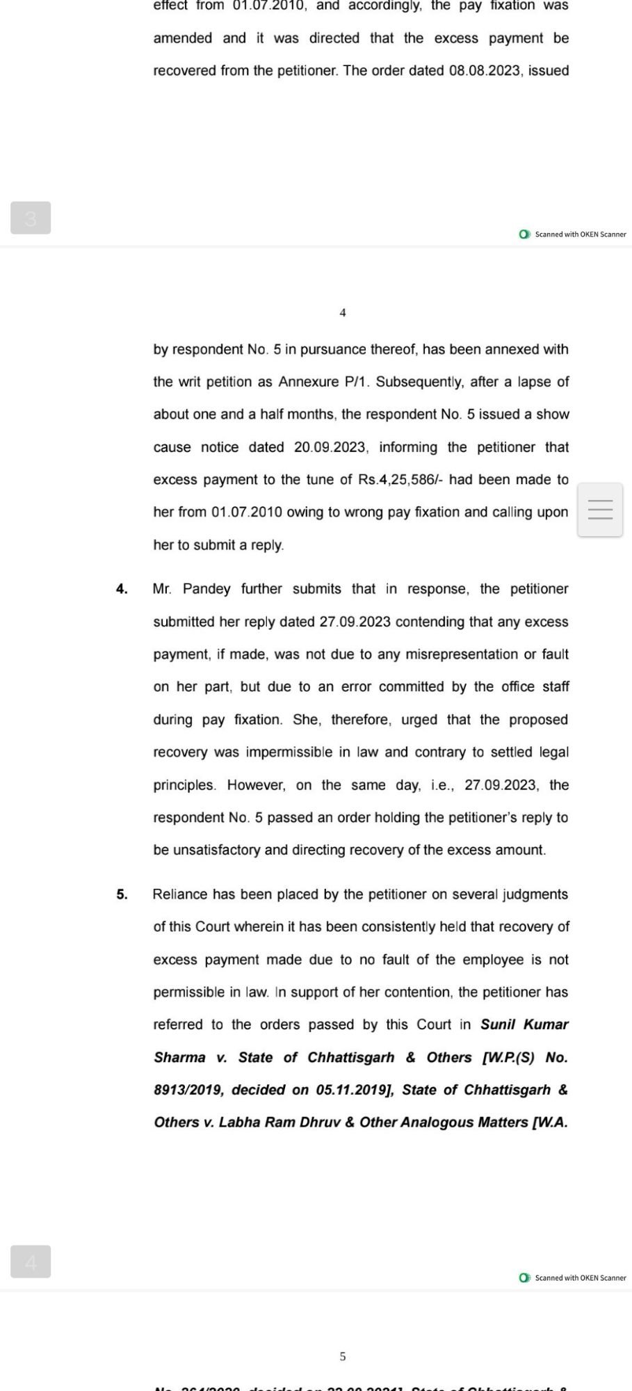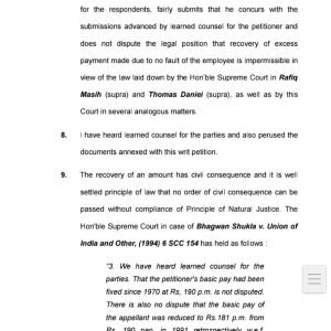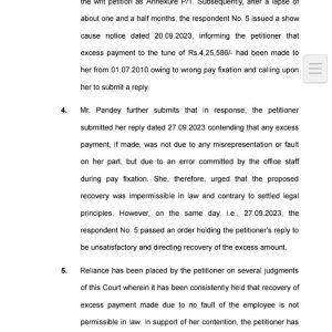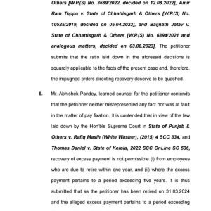 याचिकाकर्ता के अधिवक्तागण द्वारा सुप्रीम कोर्ट द्वारा स्टेट ऑफ पंजाब एवं अन्य विरूद्ध रफीक मसीह (व्हाईट वासर), थॉमस डेनियल विरूद्ध स्टेट ऑफ केरला, भगवान शुक्ला विरूद्ध यूनियन ऑफ इंडिया एवं अन्य में पारित न्याय दृष्टांत इसके साथ ही हाईकोर्ट बिलासपुर की डिवीजन बेंच द्वारा स्टेट ऑफ छत्तीसगढ़ एवं अन्य विरूद्ध लाभाराम ध्रुव में पारित न्यायदृष्टांत का हवाला दिया गया जिनमें यह सिद्धांत प्रतिपादित किया गया था कि किसी भी शासकीय अधिकारी/कर्मचारी के सेवा निवृत्त होने के 01 (एक) वर्ष पूर्व उन्हें अधिक वेतन भुगतान का हवाला देकर उनके वेतन से वसूली नहीं की जा सकती है