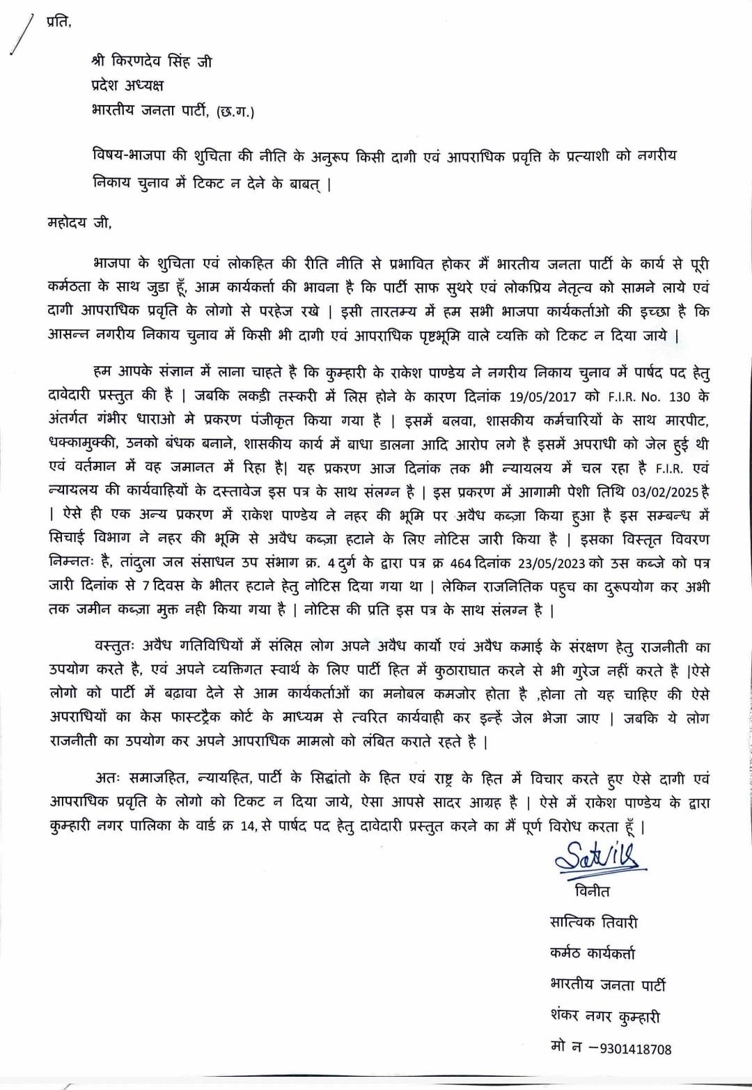 उन्होंने आग्रह किया कि पार्टी कुम्हारी नगर पालिका के वार्ड क्र. 14 से राकेश पांडेय की दावेदारी को नजरअंदाज करे और ऐसे दागी और आपराधिक प्रवृत्ति के लोगों को टिकट न दे। तिवारी ने इस पत्र के माध्यम से भाजपा के शुचिता और लोकहित की नीति को ध्यान में रखते हुए पार्टी नेतृत्व से न्याय की अपील की है।