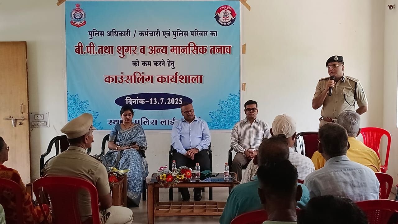 दुर्ग 13 जुलाई 2025:- आज  13/07/2025 को पुलिस अधिकारी/कर्मचारी एंव पुलिस परिवार का बी.पी.तथा शुगर व अन्य मानसिक तनाव को कम करने हेतु कार्यशाला का आयोजन, रक्षित केन्द्र दुर्ग में किया गया। उक्त कार्यशाला में  राम गोपाल गर्ग,, पुलिस महानिरीक्षक, दुर्ग रेंज दुर्ग,  विजय अग्रवाल, ,वरिष्ठ पुलिस अधीक्षक दुर्ग, डॉ.प्रमोद गुप्ता, निदेशक, सेन्ट्रल इंडिया इंस्टिट्यूट ऑफ मेंटल हेल्थ एवं ब्यूरो साईंस, दुर्ग डॉ0 सुधीर गांगेय, एम.डी.मेडिसिन, पुलिस अस्पताल, दुर्ग एवं ऋचा जैन डायटिशन दुर्ग उपस्थित थें।