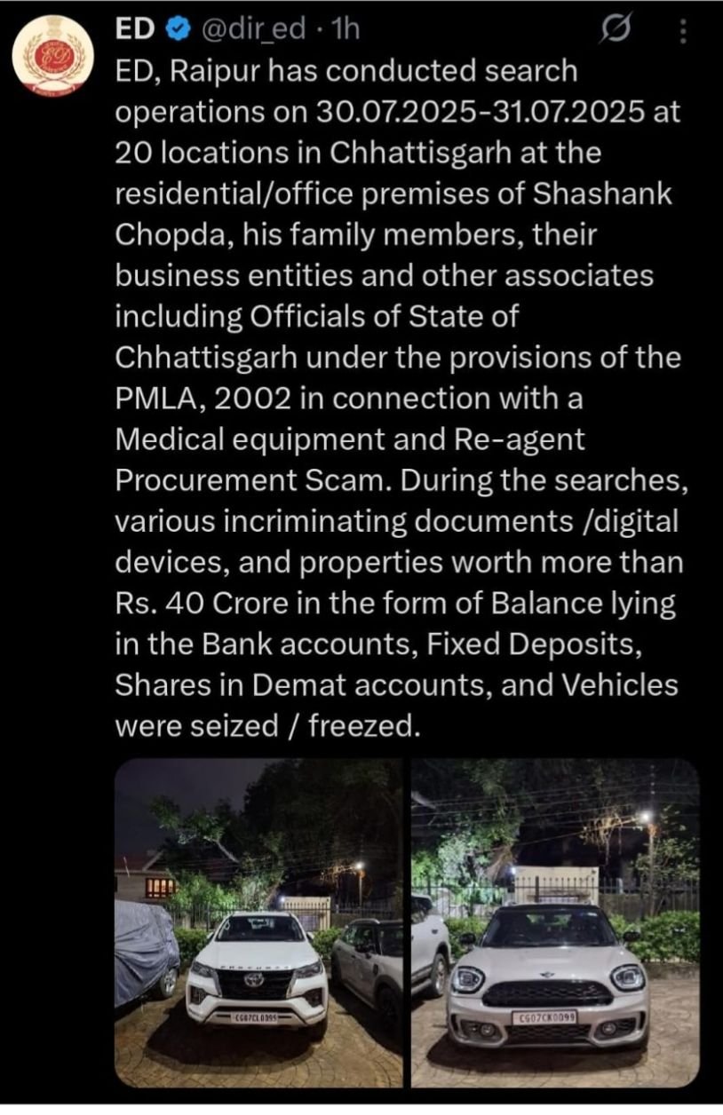 रायपुर 05 जुलाई 2025:- ईडी, रायपुर ने चिकित्सा उपकरण एवं री-एजेंट खरीद घोटाले के संबंध में पीएमएलए, 2002 के प्रावधानों के तहत छत्तीसगढ़ में शशांक चोपड़ा, उनके परिवार के सदस्यों, उनकी व्यावसायिक संस्थाओं और छत्तीसगढ़ राज्य के अधिकारियों सहित अन्य सहयोगियों के आवासीय/कार्यालय परिसरों में 30.07.2025-31.07.2025 तक 20 स्थानों पर तलाशी अभियान चलाया।