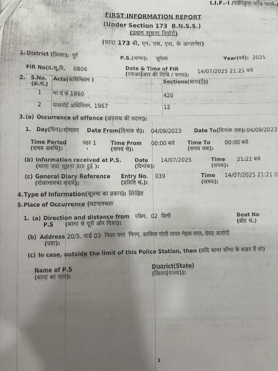 भिलाई -दुर्ग के बहुचर्चित बिल्डर, जमीन व्यापारी व फिल्म अभिनेता मनोज राजपूत के खिलाफ सुपेला थाना में केस दर्ज किया गया है. FIR में उल्लेख है कि उसने अपने आपराधिक मामले छिपाते हुए गलत तरीके से शपथ पत्र बनाया और पासपोर्ट के लिए सुपेला थाने में अनापत्ति पत्र ले लिया हालांकि पुलिस की जानकारी में जब यह मामला सामने आया तो पुलिस के पत्र पर पासपोर्ट कार्यालय से मनोज राजपूत का पासपोर्ट रद्द कर दिया गया मनोज राजपूत के खिलाफ सुपेला थाना में अपराध क्रमांक 806/2025 भा.द.सं 1860 की धारा 420,व पासपोर्ट अधिनियम 1967 की धारा 12 के तहत 14 जुलाई 2025 को अपराध दर्ज किया गया