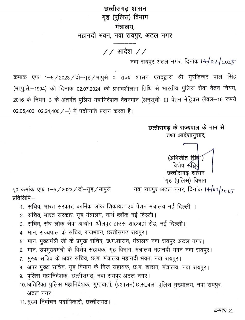रायपुर 14 फरवरी 2025 :- छत्तीसगढ़ शासन ने भारतीय पुलिस सेवा के अधिकारी गुरजिंदर पाल सिंह को पुलिस महानिदेशक के पद पर पदोन्नति किए जाने का आज आदेश जारी कर दिया है ,राज्य शासन एत द्वारा गुरजिन्दर पाल सिंह (भा.पु.से.-1994) को दिनांक 02.07.2024 की प्रभावशीलता तिथि से भारतीय पुलिस सेवा वेतन नियम, 2016 के नियम-3 के अंतर्गत पुलिस महानिदेशक वेतनमान (अनुसूची-III वेतन मेट्रिक्स लेवल 16 रूपये 02,05,400-02,24,400/-) में पदोन्नति प्रदान करता है।