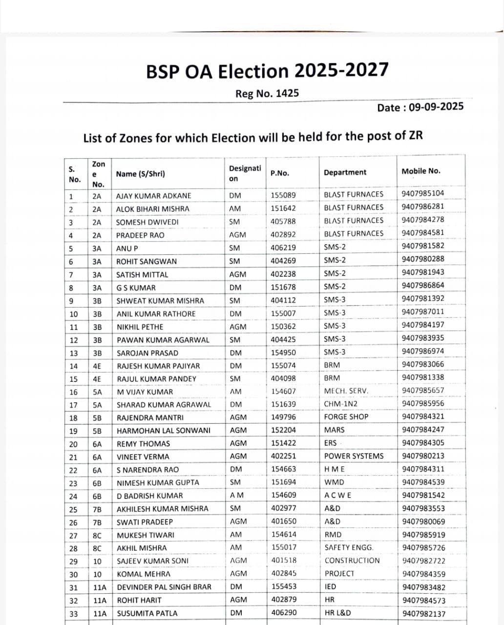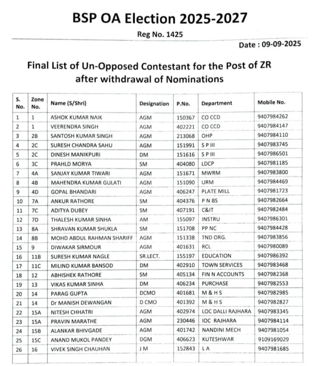 बीएसपी ऑफिसर्स एसोसिएशन चुनाव 2025 में अध्यक्ष व कोषाध्यक्ष पद पर सीधा मुकाबला है भिलाई इस्पात संयंत्र के अधिकारी 19 सितंबर को मतदान का प्रयोग करेंगे। उम्मीदवारों की लिस्ट फाइनल हो गई है। नाम वापसी के बाद अब अध्यक्ष पद पर सेफी चेयरमैन नरेंद्र कुमार बंछोर और मुकेश कुल्मी के बीच सीधा मुकाबला है। वहीं, 7 ज़ेडआर ने नाम वापस ले लिए हैं। इस तरह 44 में से 26 ज़ेडआर निर्विरोध निर्वाचित हो गए हैं।