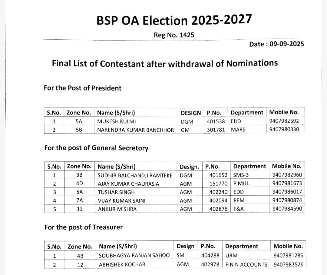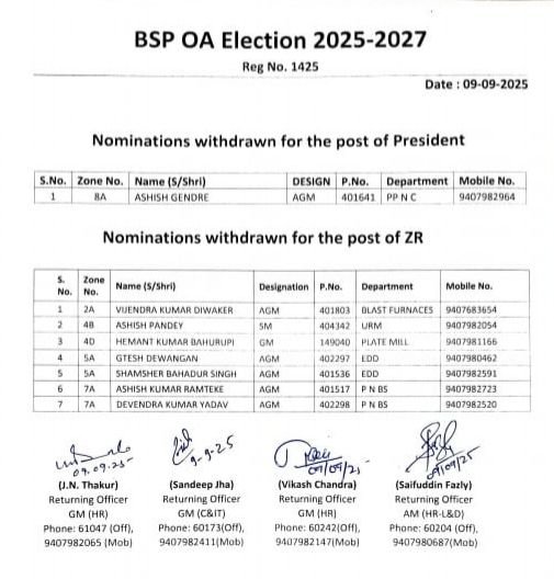 बीएसपी ऑफिसर्स एसोसिएशन चुनाव 2025… अध्यक्ष- कोषाध्यक्ष पद पर सीधा मुकाबला… महासचिव के लिए पांच उम्मीदवार चुनाव मैदान में….26 जेडआर निर्विरोध निर्वाचित…