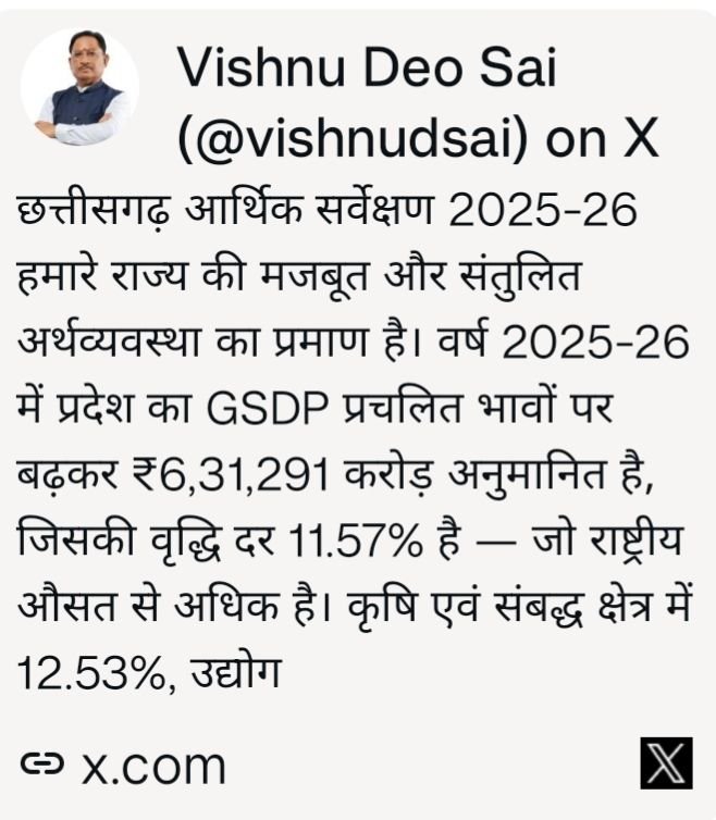 रायपुर 23 फरवरी 2026:- मुख्यमंत्री विष्णु देव साय ने कहा है कि छत्तीसगढ़ आर्थिक सर्वेक्षण 2025-26 प्रदेश की मजबूत, संतुलित और विकासोन्मुख अर्थव्यवस्था का स्पष्ट प्रमाण है। उन्होंने कहा कि राज्य सरकार की जनकल्याणकारी नीतियों, किसानों के हित में लिए गए निर्णयों, औद्योगिक निवेश को बढ़ावा देने तथा सेवा क्षेत्र के विस्तार के कारण छत्तीसगढ़ आज विकास की नई ऊंचाइयों की ओर अग्रसर है।