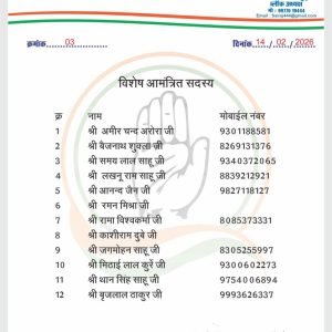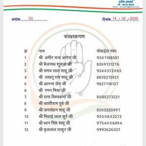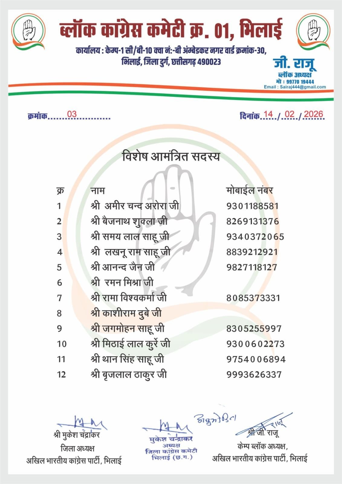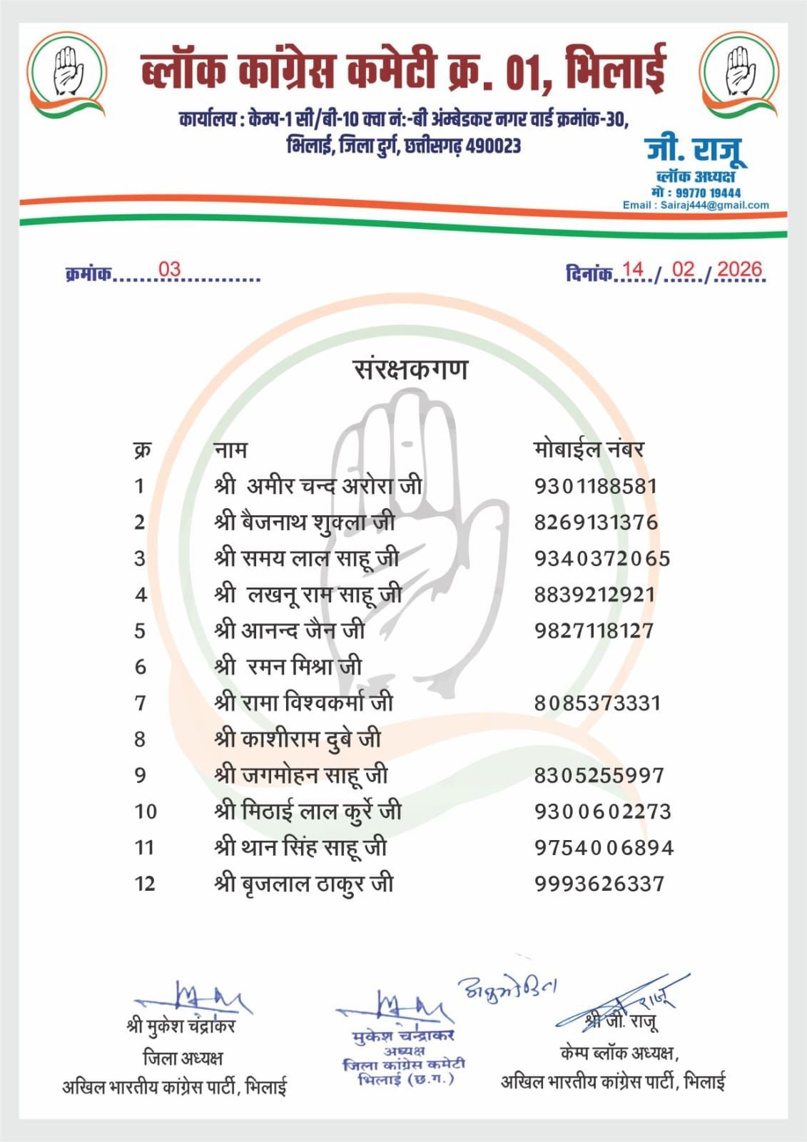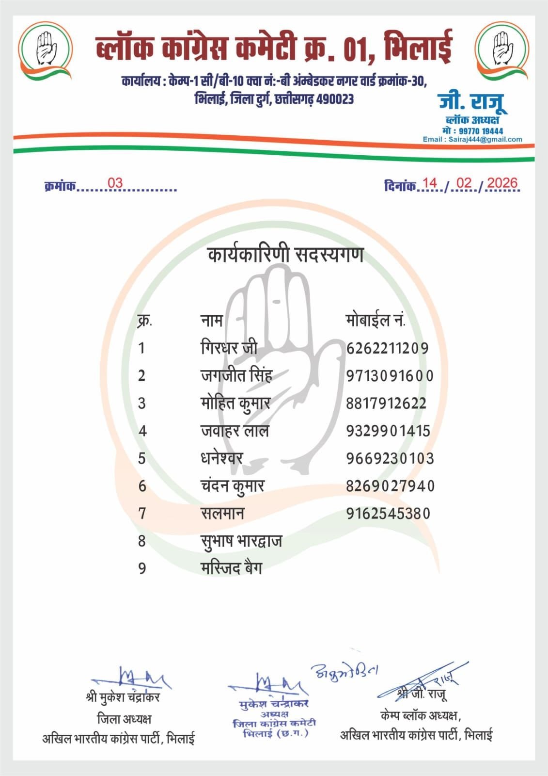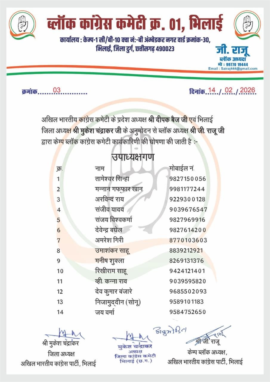 भिलाई नगर 22 फरवरी 2026:- अखिल भारतीय कांग्रेस कमेटी के प्रदेश अध्यक्ष दीपक बैज , भिलाई जिला अध्यक्ष मुकेश चंद्राकर के अनुमोदन से ब्लॉक अध्यक्ष जी. राजू द्वारा केम्प ब्लॉक कांग्रेस कमेटी कार्यकारिणी की घोषणा की गई।