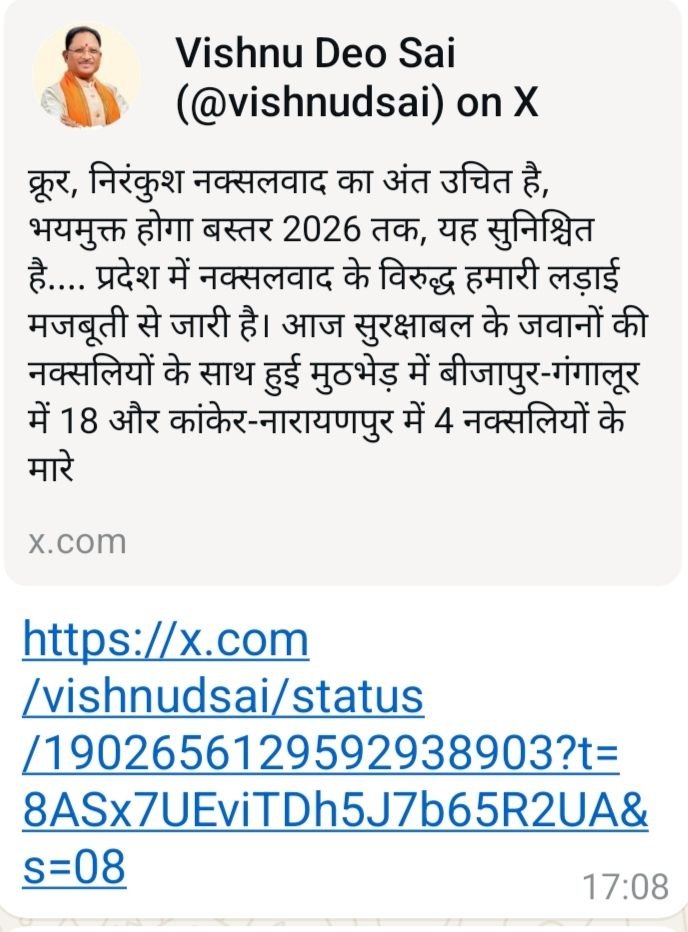 बीजापुर-कांकेर में हुई मुठभेड़ में जवानों को बड़ी सफलता मिली है। सीएम साय ने भी ट्वीट कर जवानों के अदम्य शौर्य की सराहना की है। उन्होंने ट्ववीट कर लिखा क्रूर, निरंकुश नक्सलवाद का अंत उचित है, भयमुक्त होगा बस्तर 2026 तक, यह सुनिश्चित है। प्रदेश में नक्सलवाद के विरुद्ध हमारी लड़ाई मजबूती से जारी है। आज सुरक्षाबल के जवानों की नक्सलियों के साथ हुई मुठभेड़ में बीजापुर-गंगालूर में 26 और कांकेर नारायणपुर में 4 नक्सलियों के मारे जाने की खबर है। मुठभेड़ में डीआरजी के जवान के शहीद होने की भी दुःखद खबर है। उनकी यह शहादत व्यर्थ नहीं जाएगी । यशस्वी प्रधानमंत्री नरेन्द्र मोदी एवं केंद्रीय गृह मंत्री अमित शाह के, मार्च 2026 तक देश-प्रदेश में नक्सलवाद के खात्मे के संकल्प को मजबूती प्रदान करते हुए, सुरक्षाबल के जवान निरंतर सफलता हासिल कर लक्ष्य की ओर तेजी से आगे बढ़ रहे हैं। जवानों को मिली यह सफलता सराहनीय है। उनके हौसले और अदम्य साहस को नमन करता हूं।
