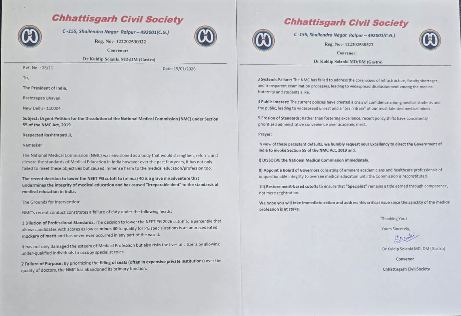 छत्तीसगढ़ सिविल सोसाइटी ने राष्ट्रपति को पत्र लिखकर NMC को तत्काल भंग करने की मांग की है।