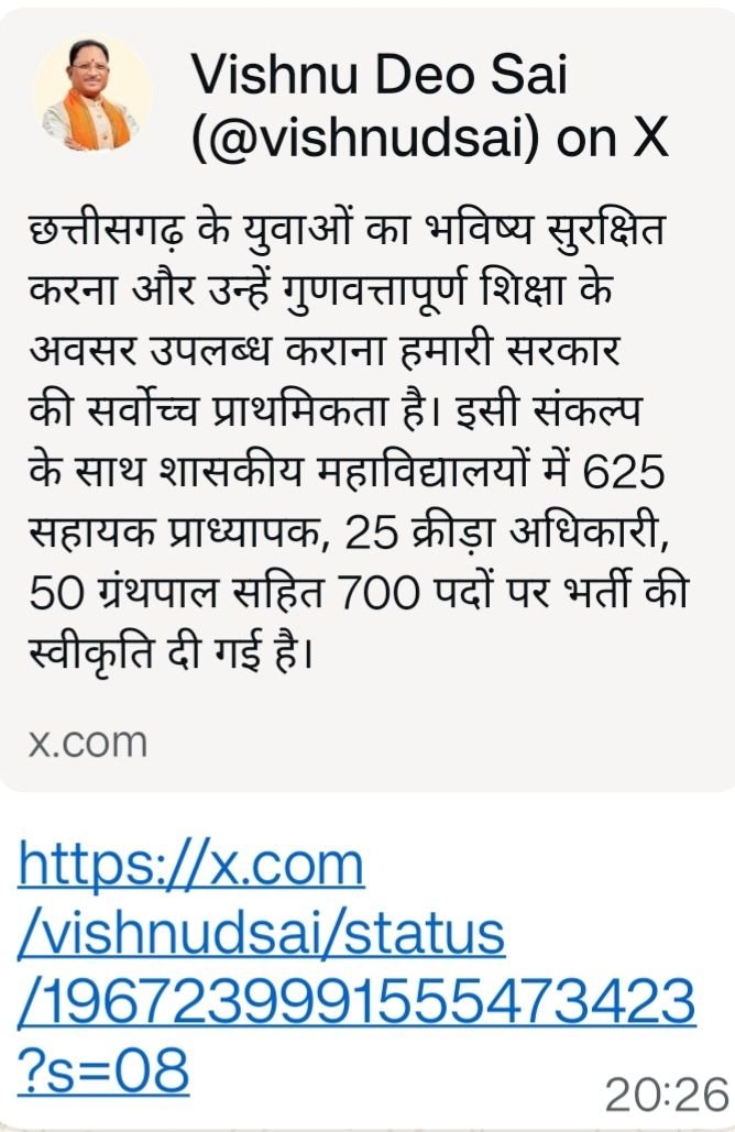 मुख्यमंत्री श्री विष्णु देव साय ने कहा कि यह निर्णय प्रदेश के युवाओं को रोजगार के अवसर उपलब्ध कराने और उच्च शिक्षा संस्थानों में गुणवत्तापूर्ण वातावरण निर्मित करने की दिशा में एक ऐतिहासिक कदम है। महाविद्यालयों में रिक्त 700 पदों पर भर्ती होने से न केवल महाविद्यालयों में शैक्षणिक स्तर सुदृढ़ होगा, बल्कि विद्यार्थियों को बेहतर मार्गदर्शन, प्रशिक्षण और सीखने के अवसर भी प्राप्त होंगे। यह पहल आने वाली पीढ़ी के भविष्य को सशक्त बनाने के साथ शिक्षा के क्षेत्र में नई ऊर्जा और प्रेरणा का संचार करेगी।