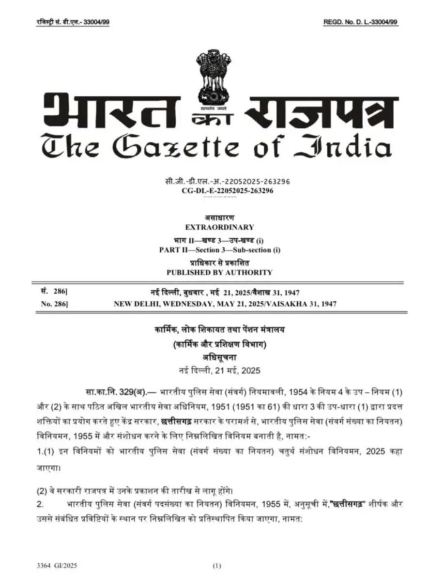 रायपुर, 25 मई 2025:- केंद्रीय कार्मिक प्रशिक्षण विभाग डीओपीटी ने करीब दो वर्ष के लंबे इंतजार के बाद छत्तीसगढ़ पुलिस कैडर का पुनरीक्षण कर नए पदों को मंजूर किया है। भारत के राजपत्र में इसका प्रकाशन भी कर दिया है। अब छत्तीसगढ़ के आईपीएस का नया कैडर 153 अफसरों का होगा । जो 2017 में मंजूर कैडर से 11 अधिक होगा।