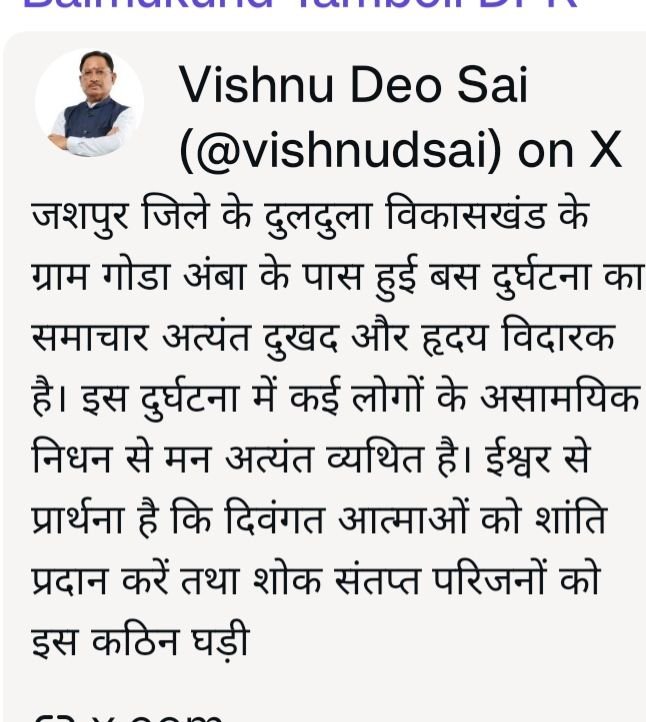 जशपुर 6 मार्च 2026:- मुख्यमंत्री  विष्णु देव साय ने जशपुर जिले के दुलदुला विकासखंड अंतर्गत ग्राम गोडा अंबा के पास हुई बस दुर्घटना पर गहरा दुःख व्यक्त किया है। उन्होंने इस दुर्घटना में लोगों के असामयिक निधन पर गहरी संवेदना व्यक्त करते हुए कहा है कि यह समाचार अत्यंत दुखद और हृदय विदारक है।