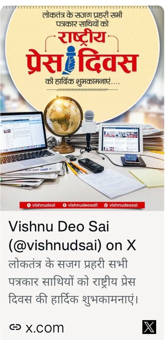 रायपुर 16 नवंबर 2025:- मुख्यमंत्री विष्णुदेव साय ने राष्ट्रीय प्रेस दिवस 16 नवंबर के अवसर पर मीडिया जगत से जुड़े सभी लोगों को बधाई एवं शुभकामनाएं दी है।