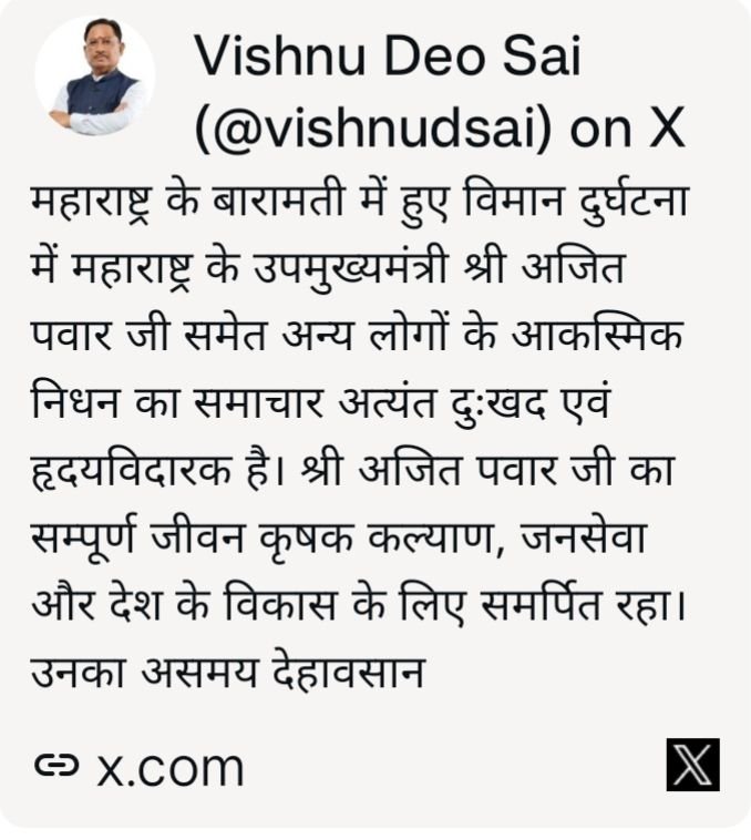 मुख्यमंत्री श्री साय ने कहा कि श्री अजित पवार जी का सम्पूर्ण जीवन कृषक कल्याण, जनसेवा और देश के विकास के लिए समर्पित रहा। उनका असमय देहावसान न केवल उनके परिजनों और समर्थकों के लिए, बल्कि महाराष्ट्र की राजनीति के लिए भी अपूरणीय क्षति है।
