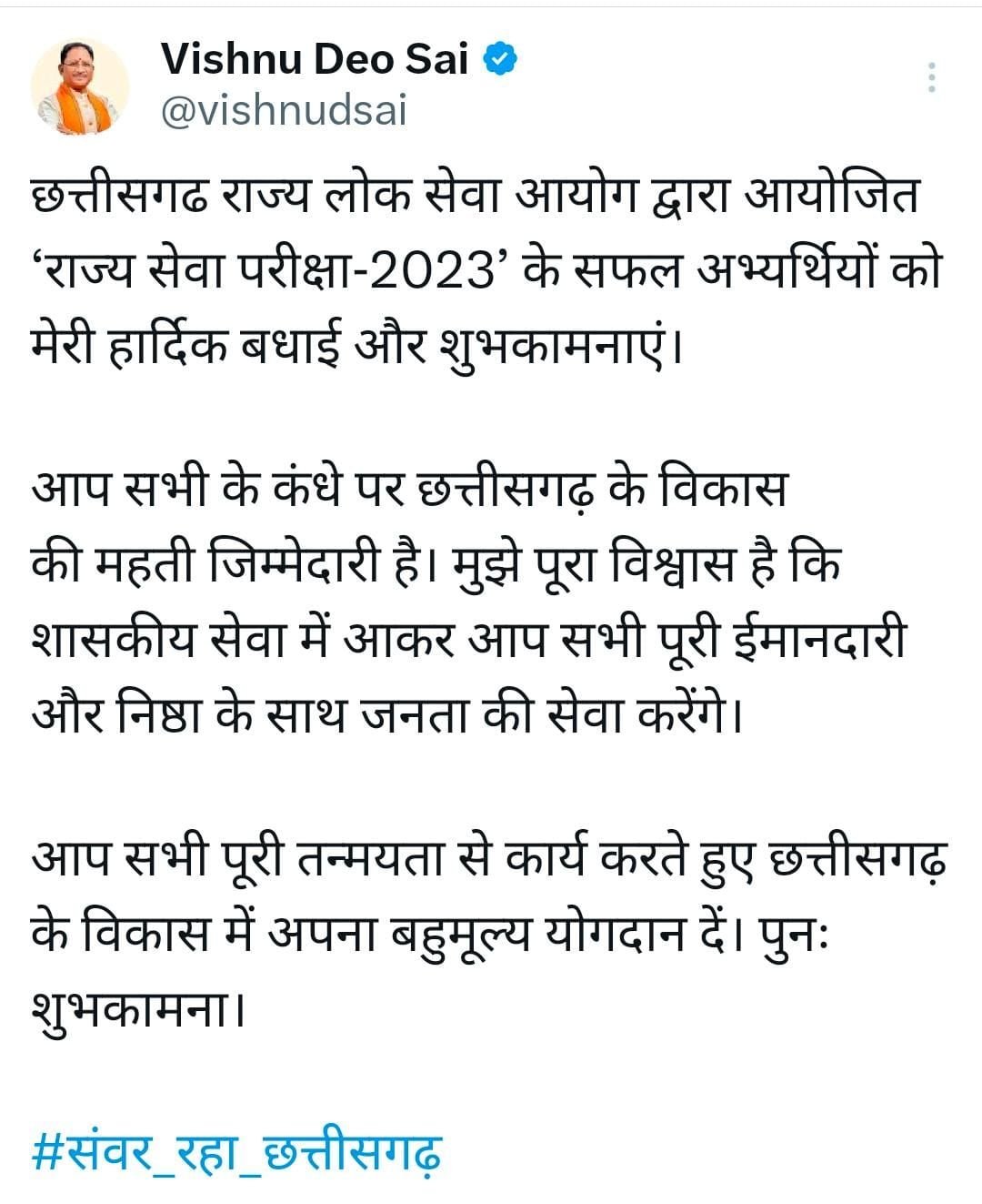 मुख्यमंत्री श्री साय ने उम्मीद जताई कि राज्य सेवा परीक्षा में चयनित युवा शासकीय सेवा में आकर पूरी ईमानदारी से जनता की सेवा करेंगे। उन्होंने चयनित युवाओं को पूरी तन्मयता से कार्य करते हुए छत्तीसगढ़ के विकास में अपना बहुमूल्य योगदान देने की अपील की है।