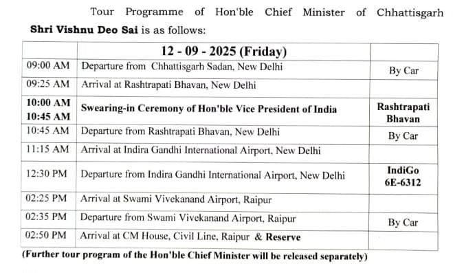 रायपुर 12 सितंबर 2025 :- मुख्यमंत्री विष्णु देव साय शुक्रवार 12 सितंबर को दिल्ली प्रवास पर जा रहें हैं। जहां वे केंद्रीय मंत्रियों से मुलाकात करेंगे। वे शुक्रवार 12 सितंबर को नव निर्वाचित उप राष्ट्रपति राधाकृष्णन के शपथ ग्रहण समारोह में शामिल होंगे। शपथ समारोह राष्ट्रपति भवन में आयोजित किया गया है।
