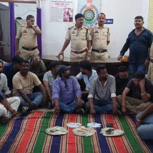 अमलेश्वर पुलिस ने गोपा बाड़ी ग्राम खुड़मुडा के पास थाना अमलेश्वर 04.05.2025 के 21.15 बजे, जुआ खेलते आरोपी . सुरेश बिजवानी पिता किशन चंद बिजवानी 30 साल निवासी शिवम विहार थाना डीडीनगर जिला रायपुर, पवन सोनकर पिता नीलकंठ सोनकर 38 साल निवासी भाठागांव चौक वार्ड क्र0 61 राम मंदिर के पास थाना पुरानी बस्ती रायपुर, . दुर्गेश विश्वकर्मा पिता शिवशंकर विश्वकर्मा 35 साल निवासी वार्ड 61केसरी बगीचा भाठागांव थाना पुरानी बस्ती रायपुर . महेन्द्र वर्मा पिता के0एल0 वर्मा 45 वर्ष निवासी ब्रम्हदेव कालोनी भाठागांव थाना पुरानी बस्ती रायपुर सुरेश कुमार पिता कहर कुमार 40 साल निवासी ब्रम्हदेव कालोनी भाठागांव थाना पुरानी बस्ती रायपुर, रामू ताण्डी पिता धनेश्वर ताण्डी 40 साल निवासी अवंती विहार विजय नगर थाना खम्हारडीह रायपुर, राजेश चंद्रवंशी पिता मुखीराम चंद्रवंशी 45 साल निवासी सेक्टर 01 प्रोफेसर कालोनी थाना पुरानी बस्ती रायपुर, उमेश यादव पिता वासुदेव यादव 39 साल निवासी भाठागांव हिरापारा दंण्तेश्वरी मंदिर के पास थाना डीडीनगर रायपुर . डिकू सोनकर उर्फ डिकेश्वर पिता मोहन लाल सोनकर 31 साल निवासी ग्राम खुड़मुड़ा थाना अमलेश्वर दुर्ग, ईश्वर सोनकर पिता स्व० बजारू राम सोनकर 29 साल निवासी ग्राम खुडमुड़ा थाना अमलेश्वर दुर्ग, चुम्मन देवांगन पिता चम्पा लाल देवांगन 48 वर्ष निवासी भाठागांव अवधपूरी थाना टिकरापारा जिला रायपुर, हेमलाल निषाद पिता मनीराम निषाद 40 साल निवासी कचना पीएम आवास थाना विधानसभा रायपुर, दीपक वर्मा पिता लक्ष्मण प्रसाद वर्मा 38 साल निवासी रायपुरा शिवन स्कूल के पास थाना डीडीनगर रायपुर ,दीपक ध्रुव पिता स्व० बुंदेल 42 साल निवासी कुशालपुर शासकीय प्राथमिक शाला के पास थाना पुरानी बस्ती रायपुर, मोनू उर्फ मोरध्वज साहू पिता खोमलाल साहू 36 साल निवासी वुड आई लैण्ड कालोनी अमलेश्वर थाना अमलेश्वर दुर्ग, को पकड़ा गया सूत्रों के अनुसार जुआं खेल रहे कुछ अन्य जुआडी पुलिस को आता देख भाग खड़े हुए।