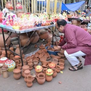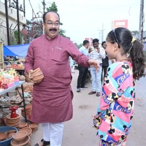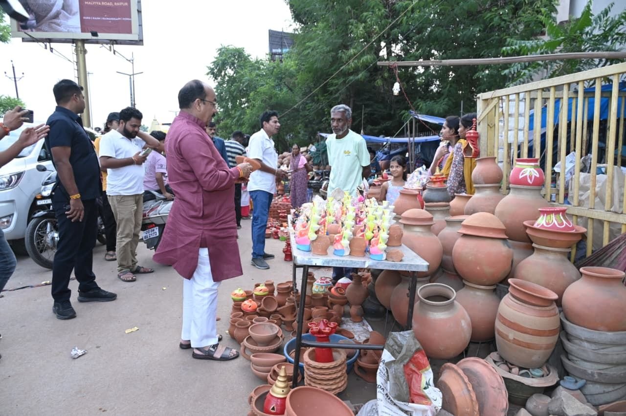 उप मुख्यमंत्री श्री साव ने कालीबाड़ी चौक के आसपास बैठे छोटे व्यापारियों से दिए और मूर्ति खरीदे, मिलने आए नन्हें बच्चों को हाथ मिलाकर दीपावली की बधाई दी।
