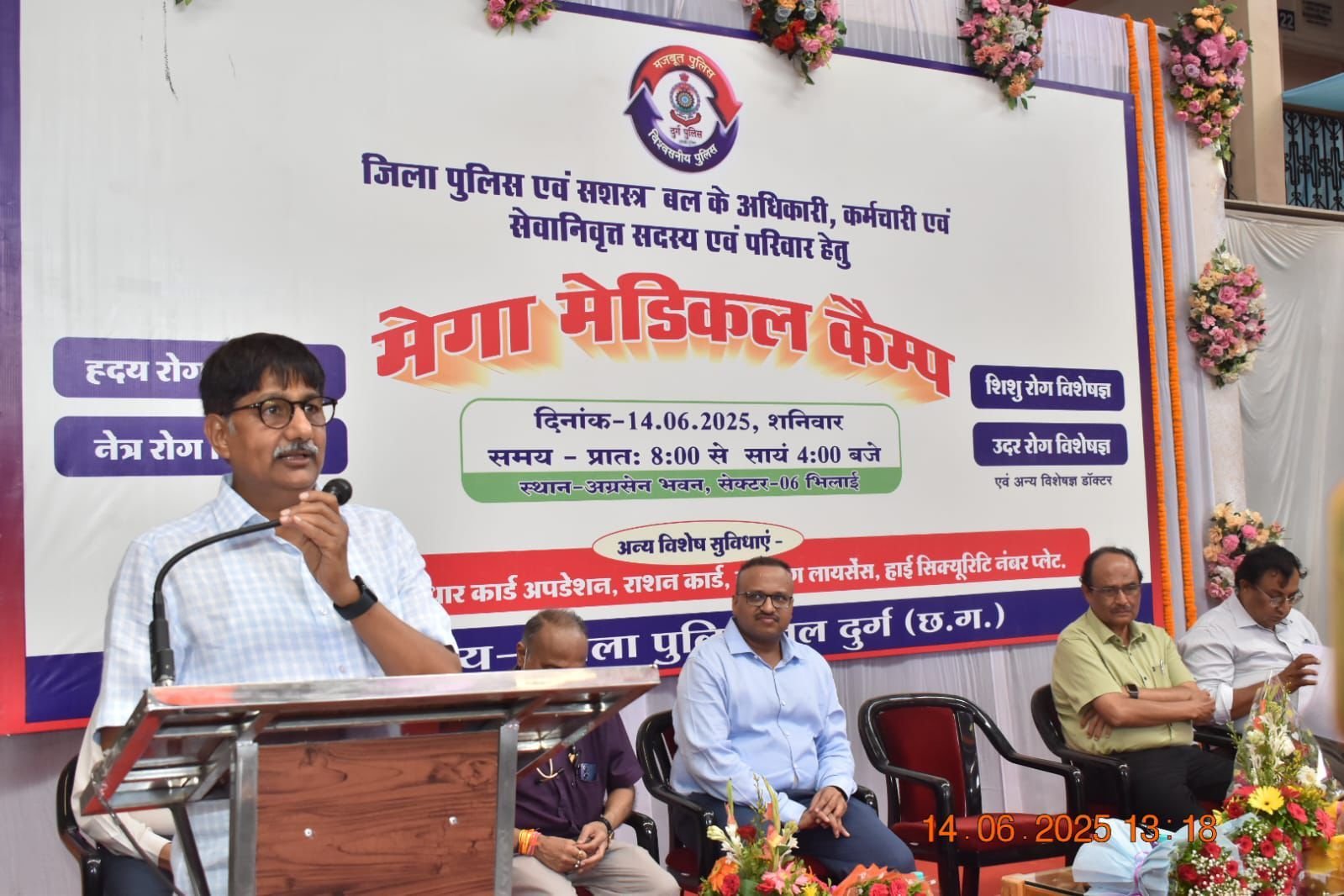 विजय अग्रवाल वरिष्ठ पुलिस अधीक्षक दुर्ग ने स्वागत उद्बोधन में कहा कि इस शिविर का आयोजन मान. पुलिस महानिदेशक, छ.ग. के प्रेरणा से किया गया । पुलिस की नौकरी चाहे वह जिला पुलिस बल की हो, एसटीएफ या सीएएफ की हो, बाकी नौकरियों से पृथक होती है, पुलिस के पास इतना समय नहीं होता है कि लगातार वे अपने स्वास्थ्य पर ध्यान दें एवं उसका समय पर उपचार कराएं, इसलिए इस शिविर के माध्यम से कोशिश किया जा रहा है कि यदि कोई शारीरिक समस्या है तो उसे पहचाने और समय पर उसका उपचार कराएं । डीजीपी सर की ये परिकल्पना थी, उसको साकार करने के लिए आईएमए एवं पूरे शहर के वरिष्ठ डाक्टरों का खुले मन से सहयोग प्राप्त हुआ और आशा है कि आगे भी इनका सहयोग प्राप्त होता रहेगा, जिन्हें पूरे पुलिस परिवार की ओर से धन्यवाद दिया गया।