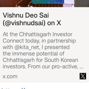 इस अवसर पर मुख्यमंत्री श्री साय ने भारत के राजदूत श्री अमित कुमार से भारतीय दूतावास, सियोल में मुलाक़ात कर छत्तीसगढ़ में निवेश संभावनाओं पर विस्तार से चर्चा की। मुख्यमंत्री श्री साय ने कहा कि हमने स्टील और खनिज से लेकर इलेक्ट्रॉनिक्स व फूड प्रोसेसिंग तक, मजबूत द्विपक्षीय आर्थिक साझेदारी की संभावनाओं पर विचार-विमर्श किया है।