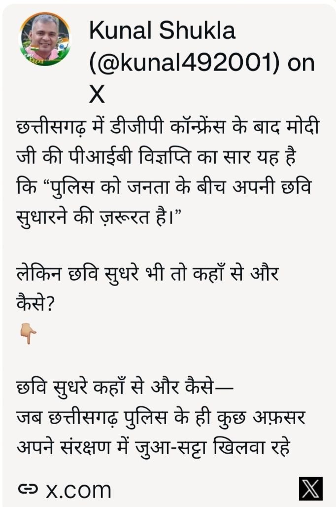 78 लाख लूटकांड की जांच अपनी जगह ठप है और खेतों में लाखों का जुआ भी अपनी जगह बेकाबू है। यही जांजगीर की जमीनी तस्वीर है जो प्रधानमंत्री की सलाह के ठीक उलट दिशा में जाती दिख रही है। यह स्थिति बताती है कि पुलिस की छवि सुधारने का रास्ता सिर्फ गश्त बढ़ाने या पोस्टर लगाने से नहीं बल्कि नेटवर्क तोड़ने, अपराधियों को पकड़ने और ठोस परिणाम देने से होकर गुजरता है।